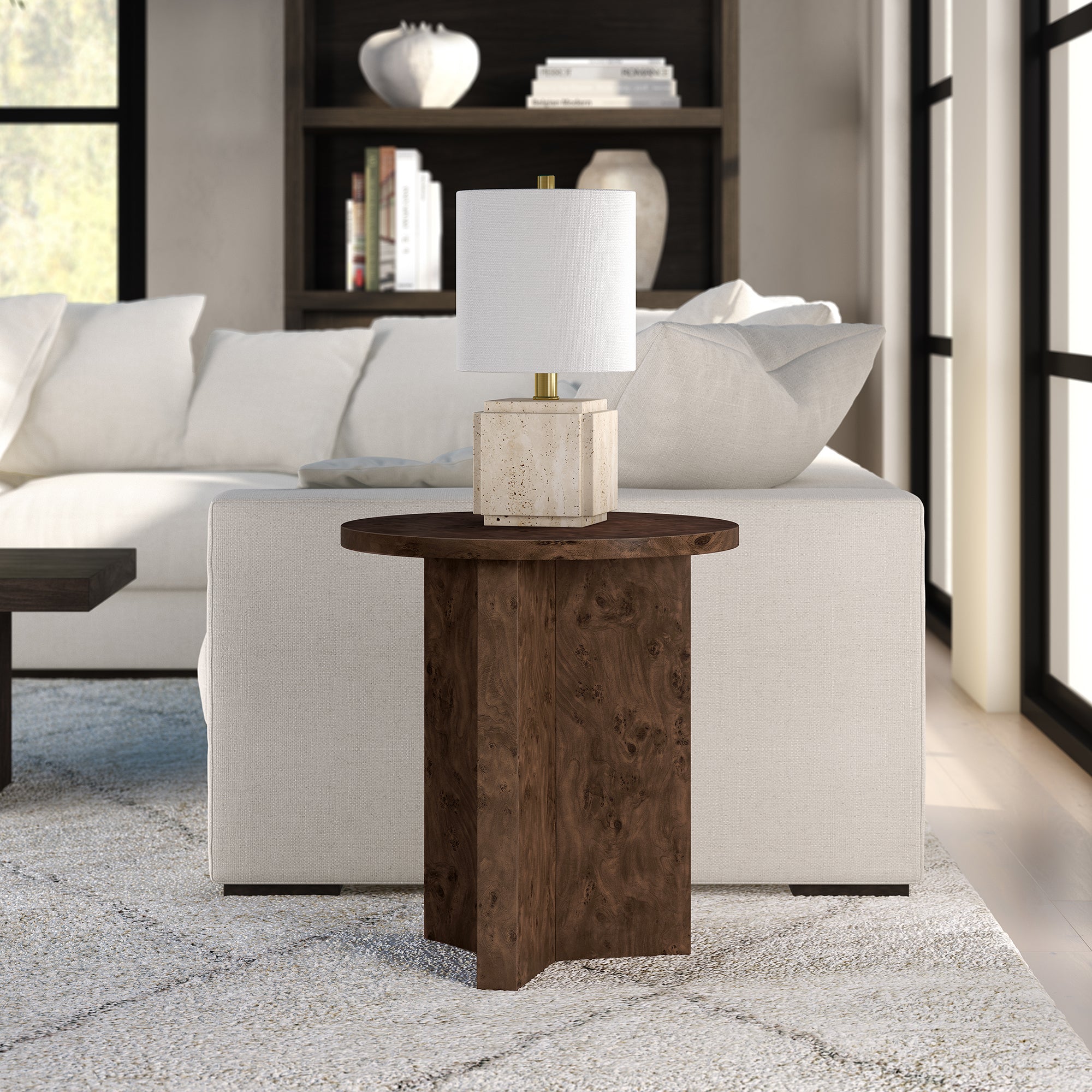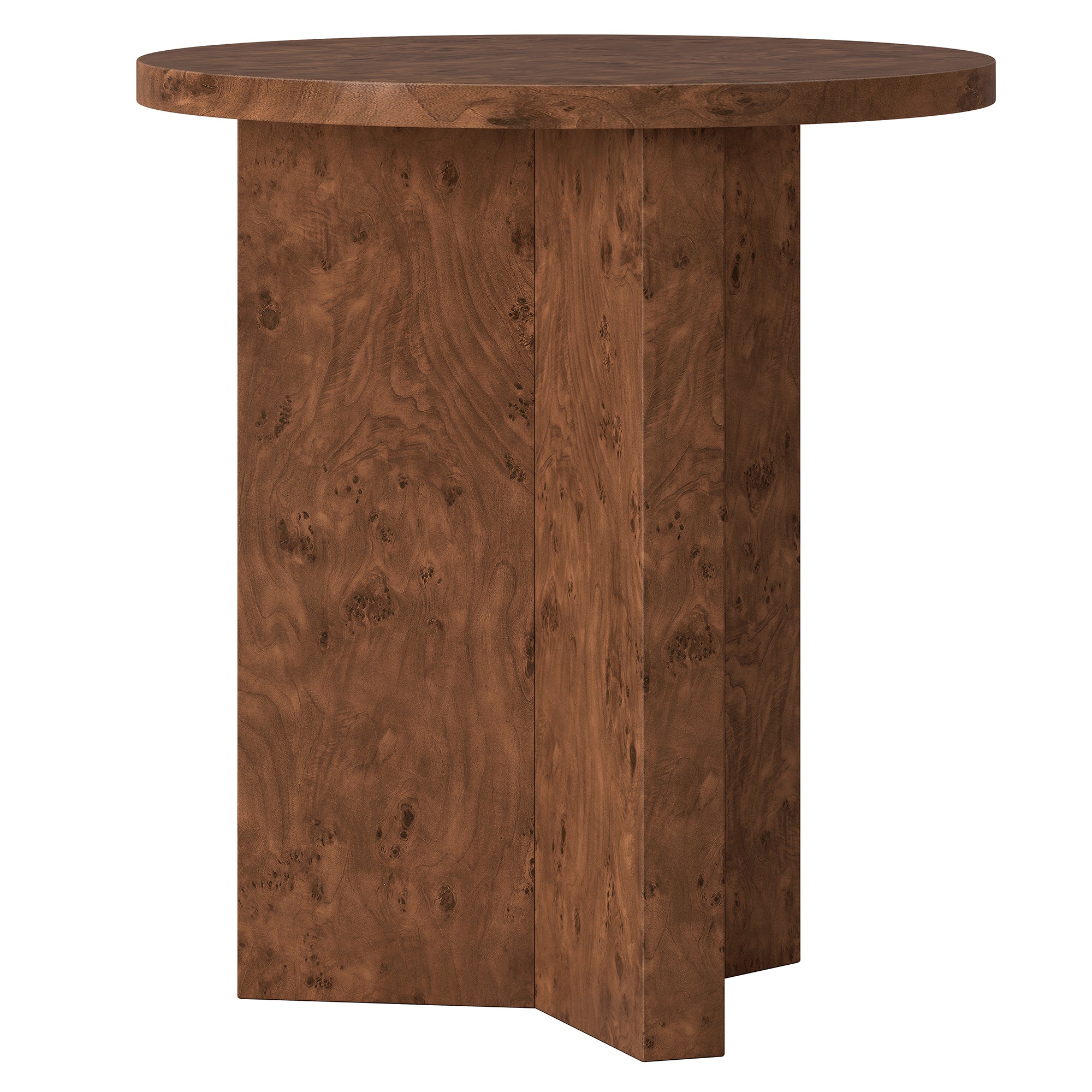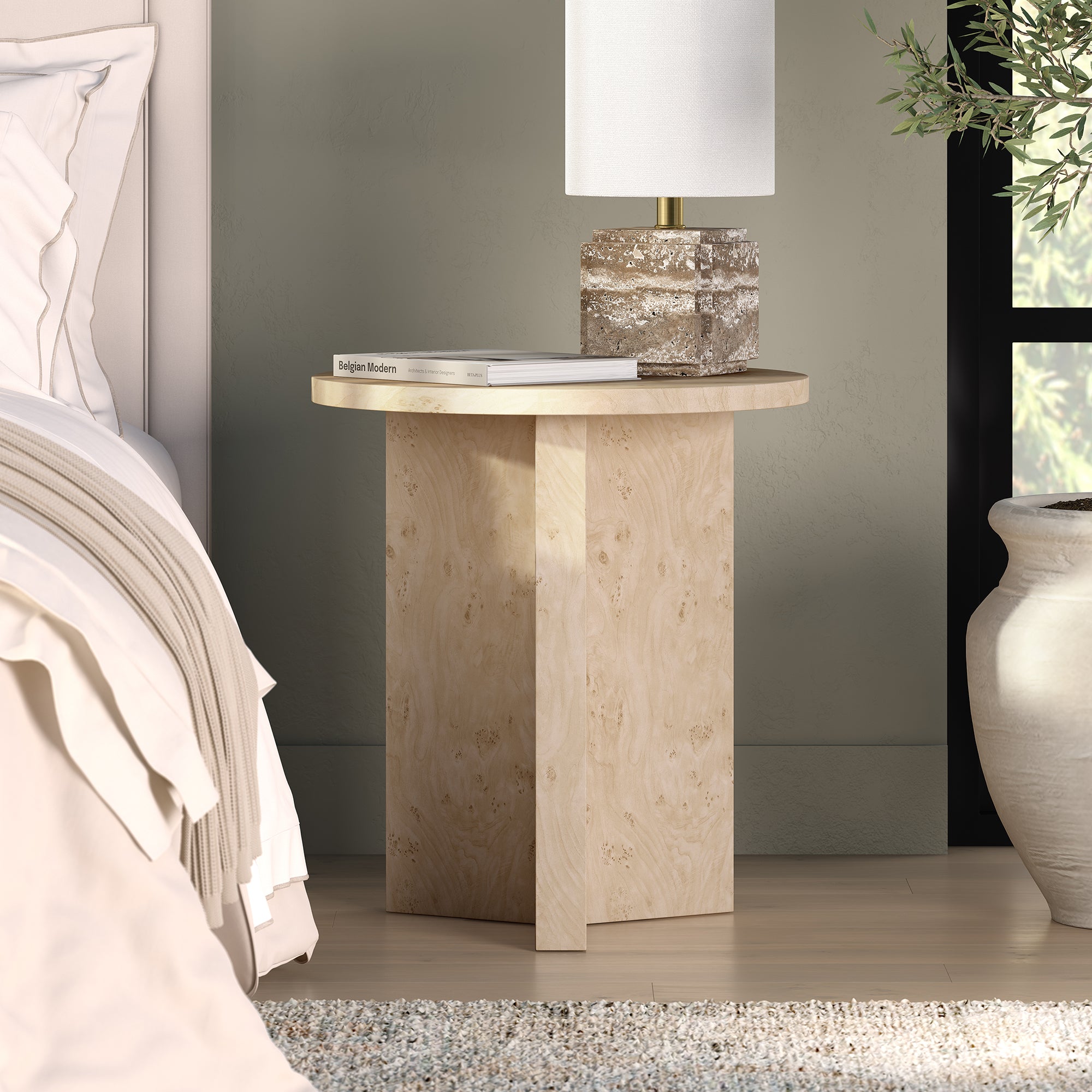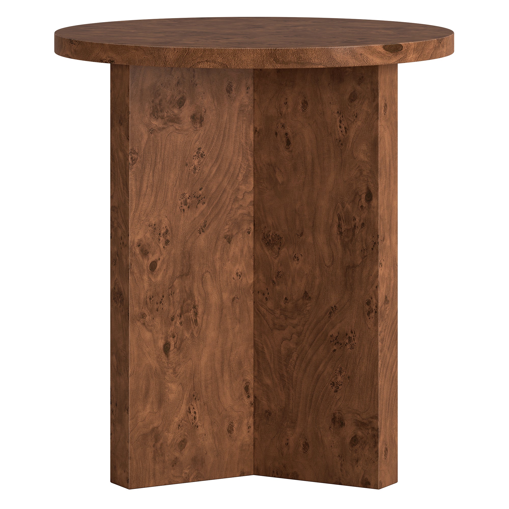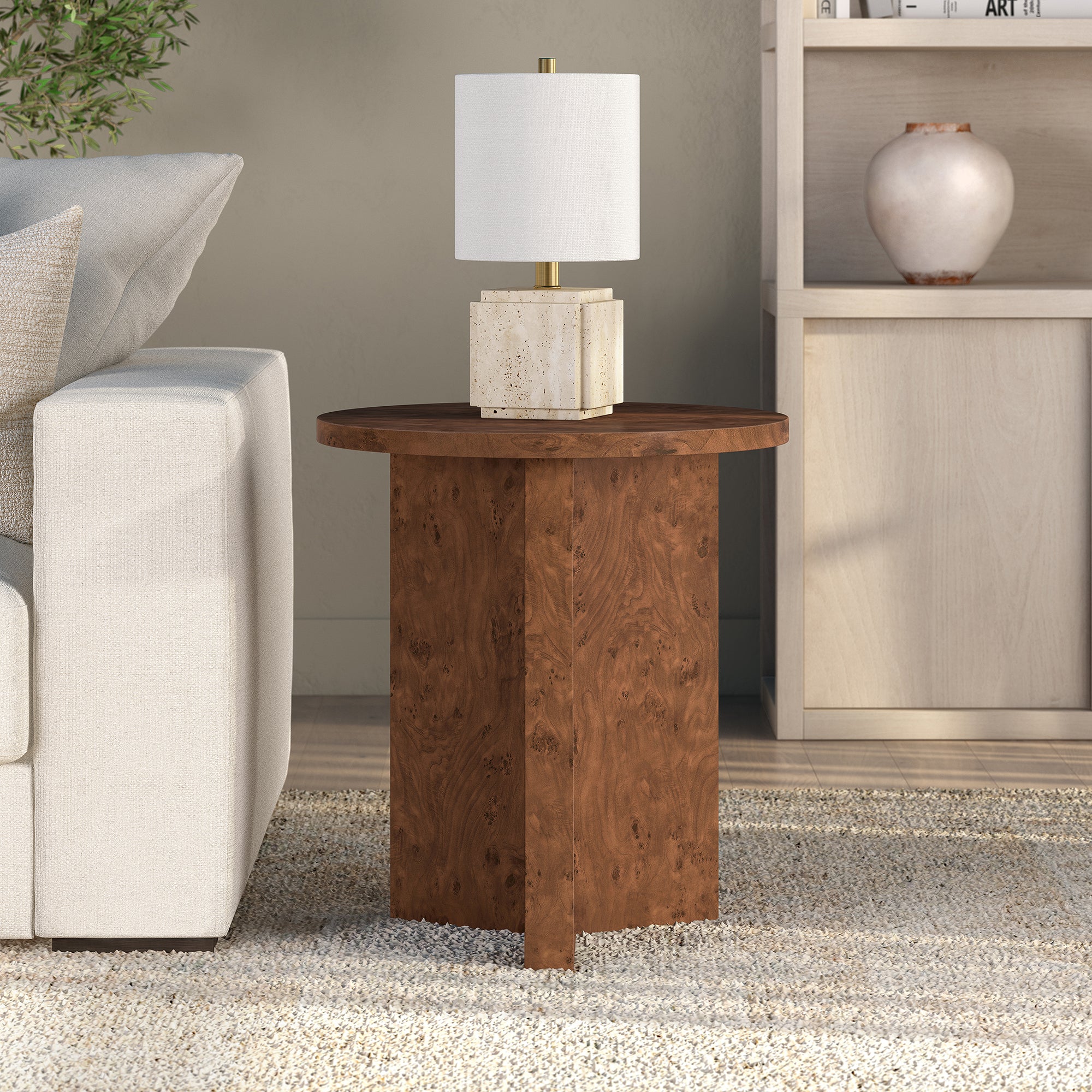 Striking in its simplicity, but with an eye catching finish and texture, this Scandinavian inspired side table emphasizes clean lines with a unique wood look. The sturdy base anchors the look, while the burl natural variation finish adds visual texture and tonal variation to your space. Featuring a 25 lb weight capacity and adjustable leveling feet under the base, this 20" round table will grant your living space with a new and on-trend focal point.