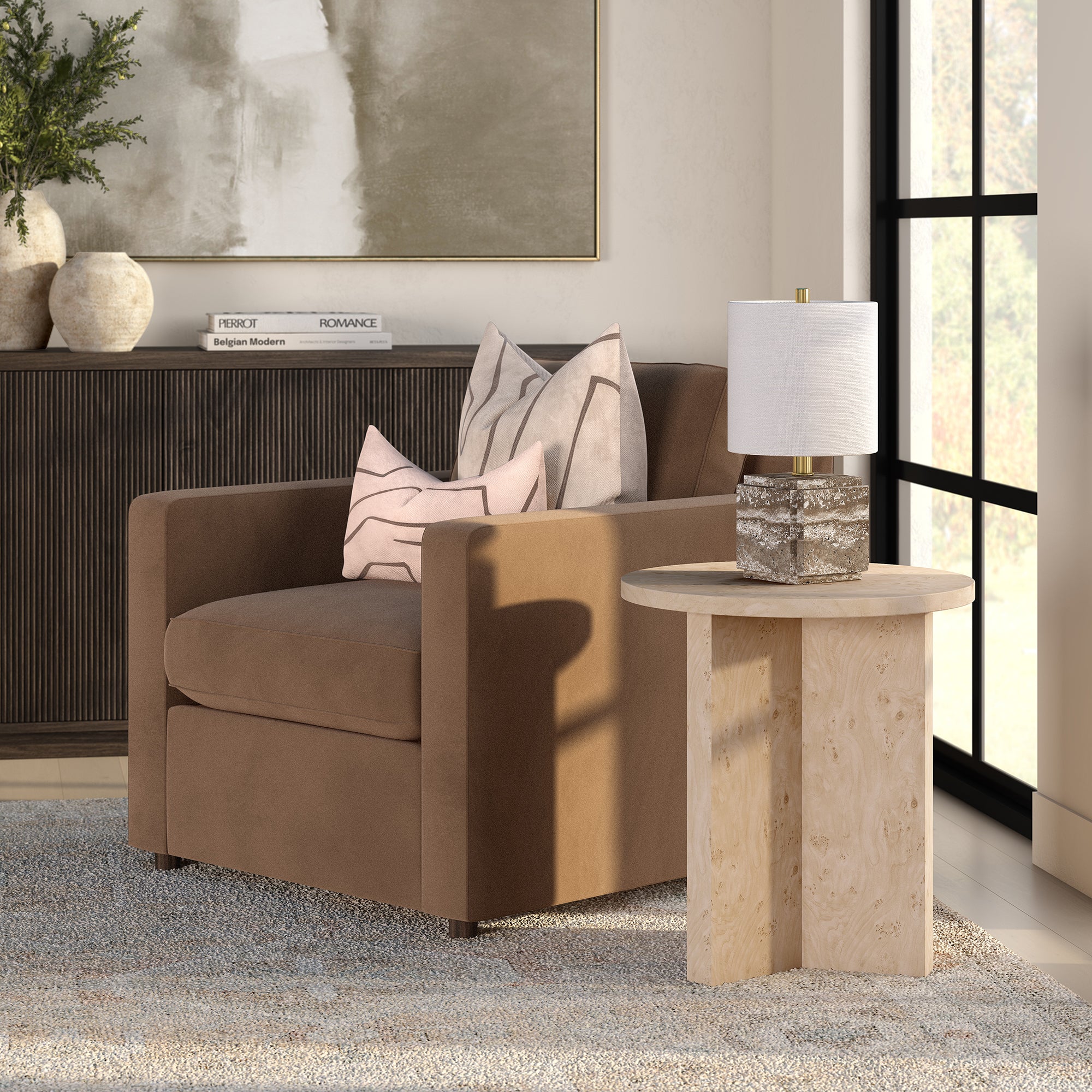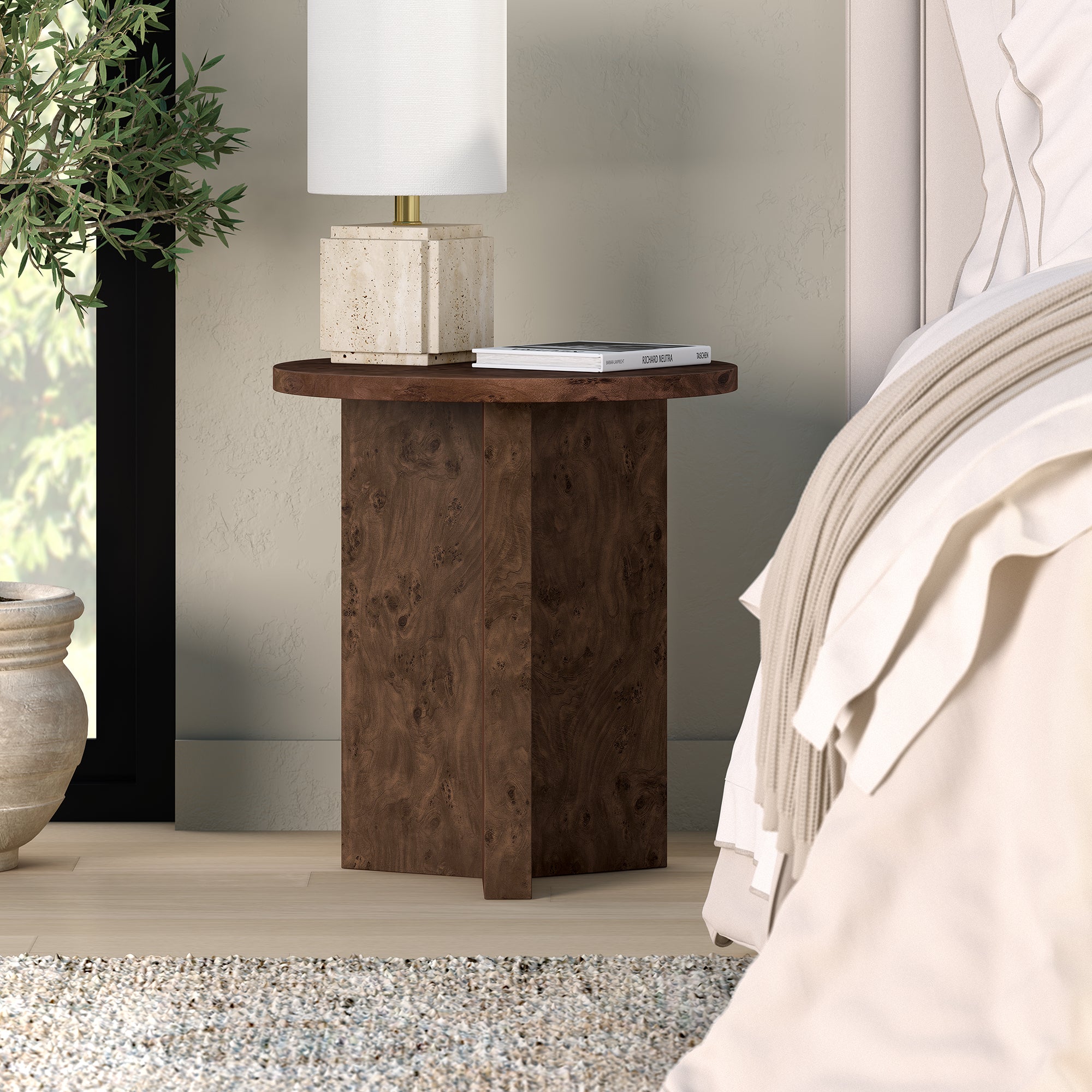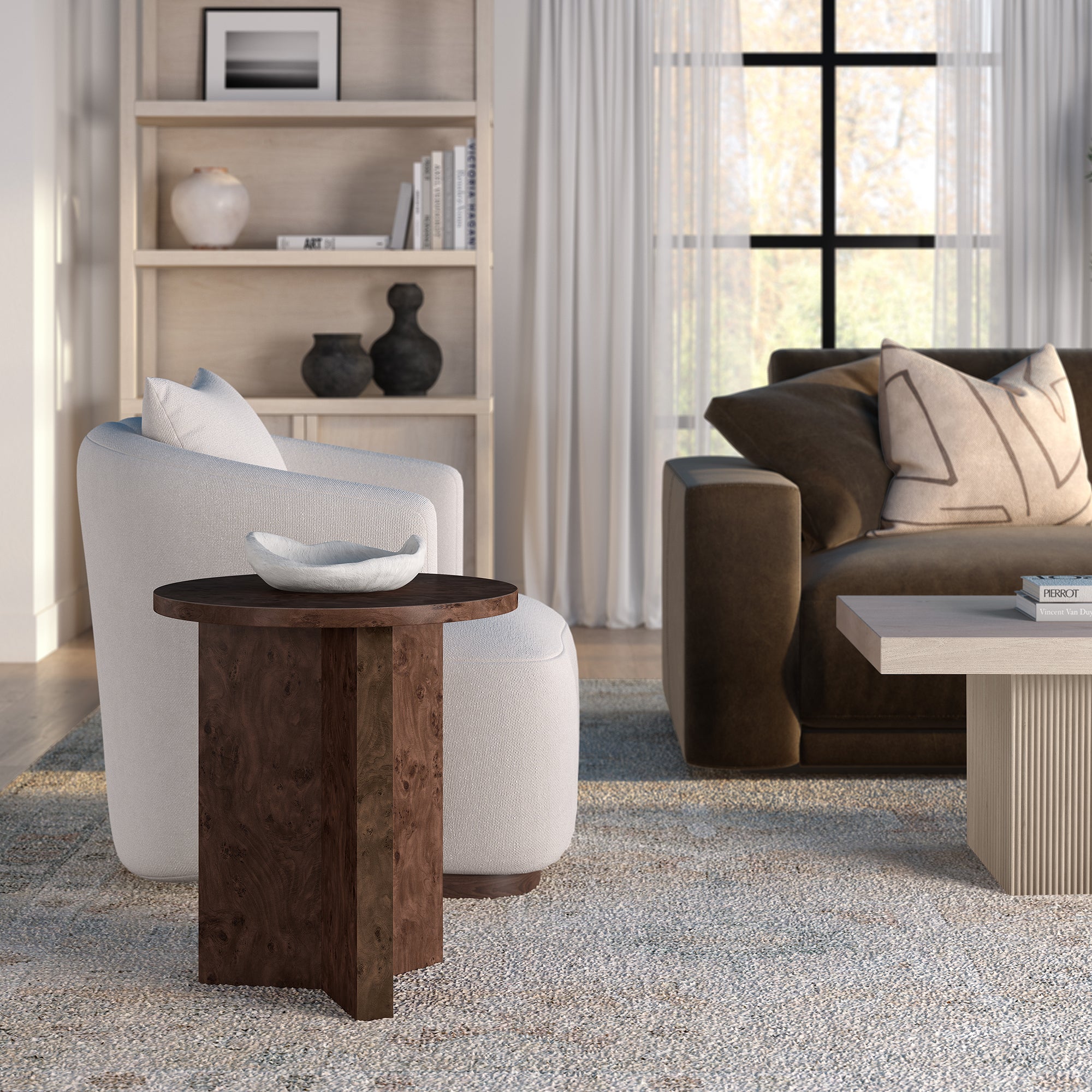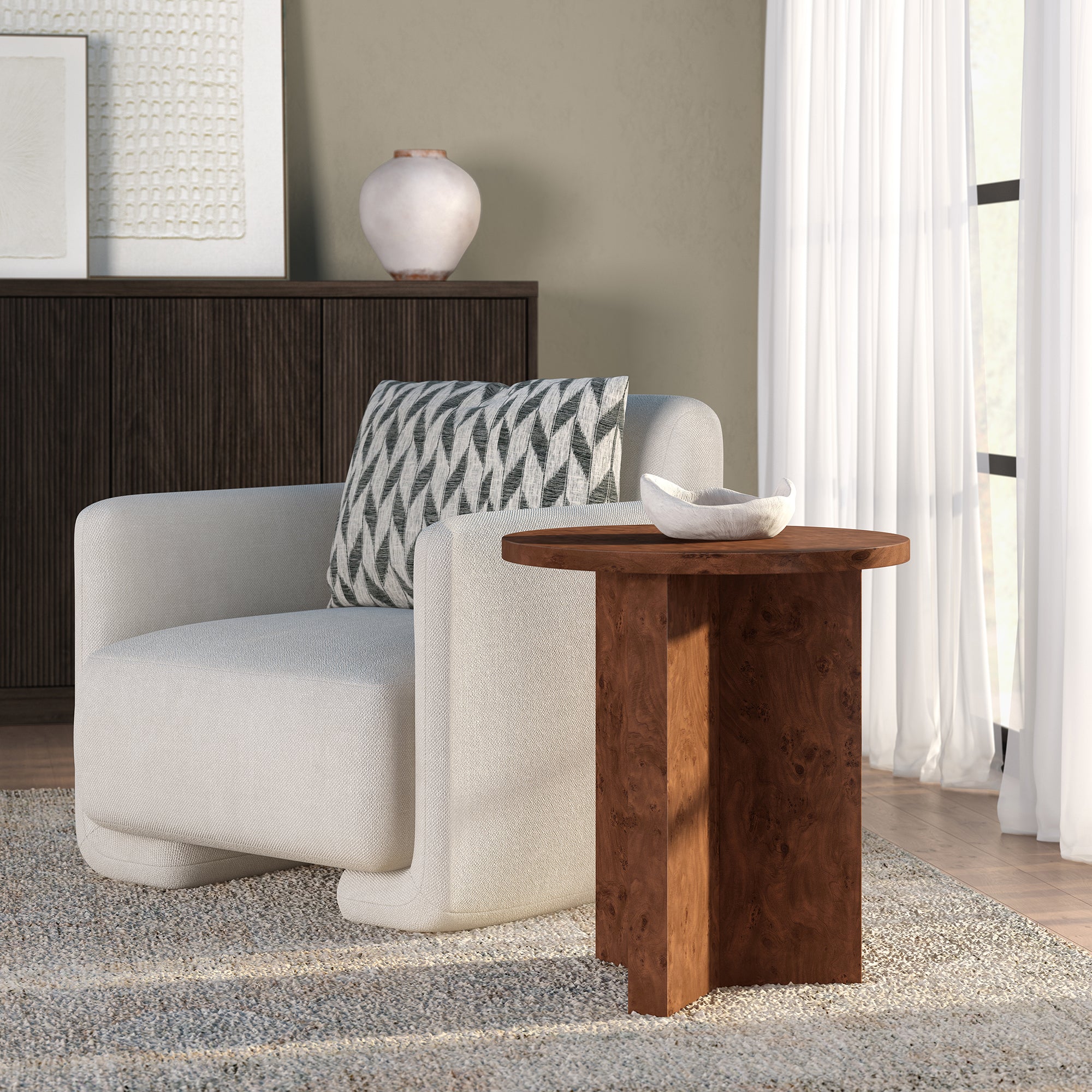 Striking in its simplicity, but with an eye catching finish and texture, this Scandinavian inspired side table emphasizes clean lines with a unique wood look. The sturdy base anchors the look, while the burl natural variation finish adds visual texture and tonal variation to your space. Featuring a 25 lb weight capacity and adjustable leveling feet under the base, this 20" round table will grant your living space with a new and on-trend focal point.