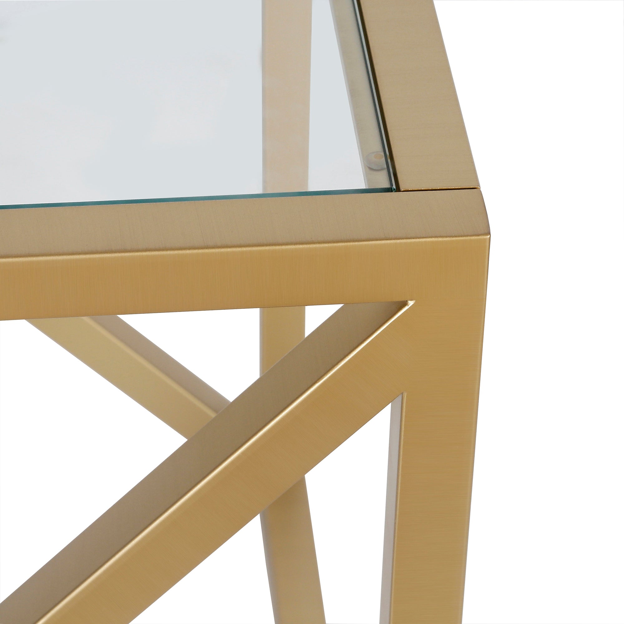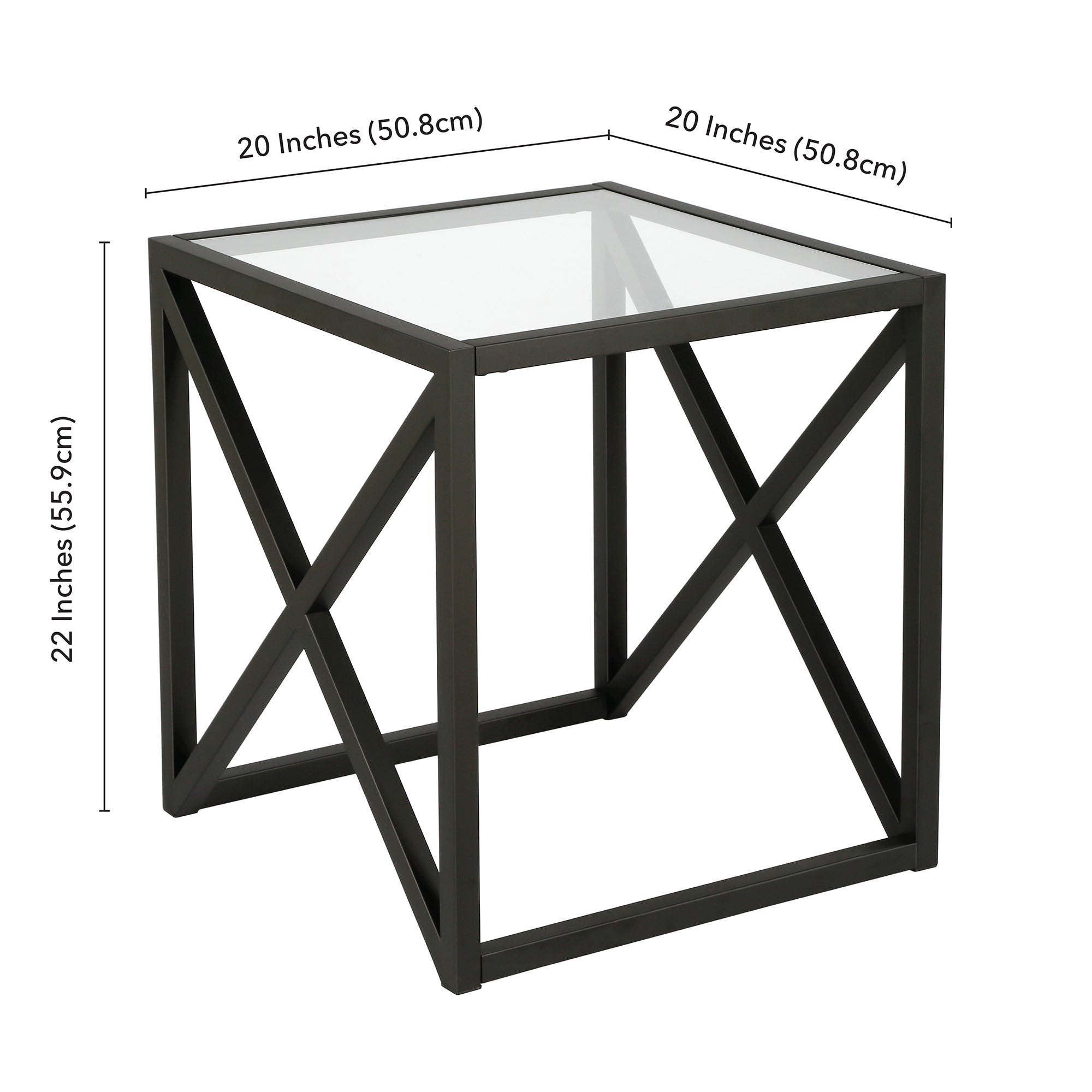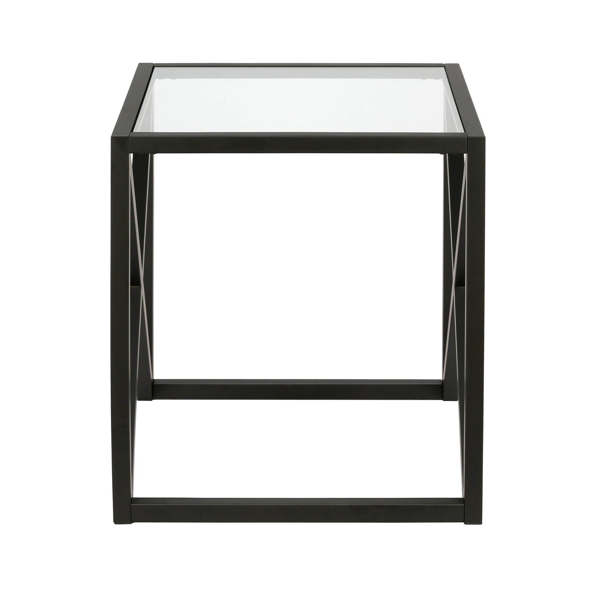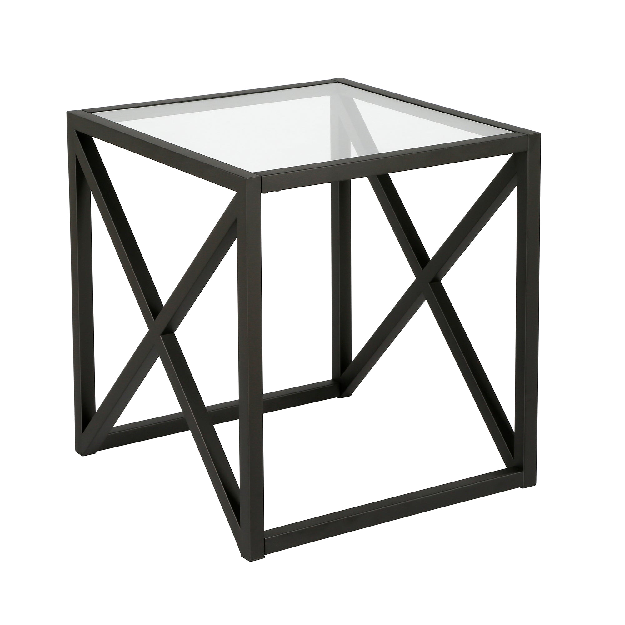 This urban inspired end table is the perfect pick for your living room or den ensemble. Its base features x-shaped legs creating geometric interest. The top is a transparent tempered glass which shows off the architectural connection and carries the structured design through the frame.