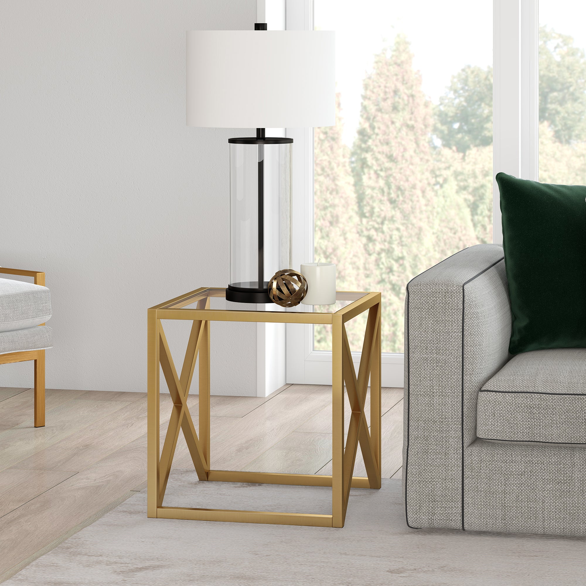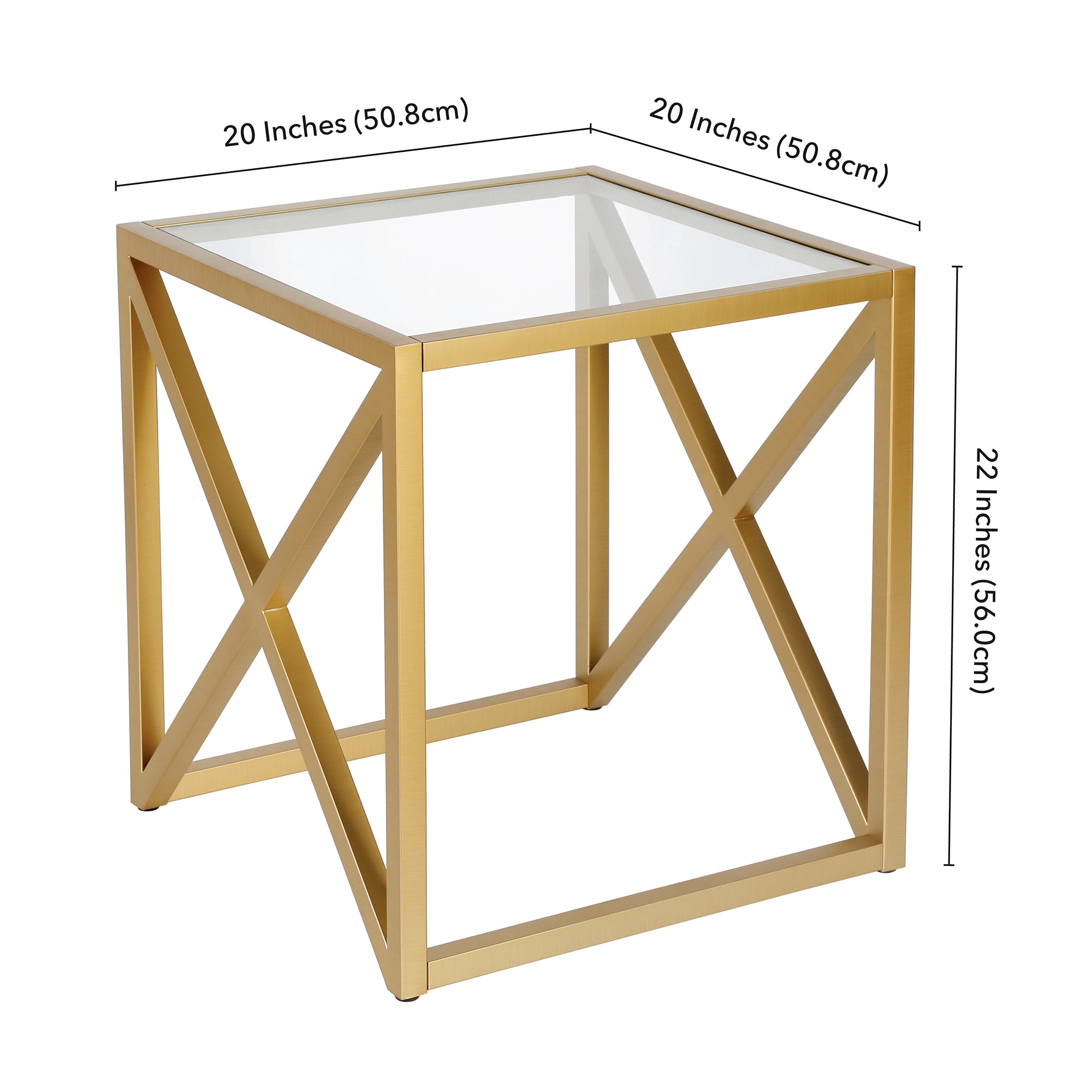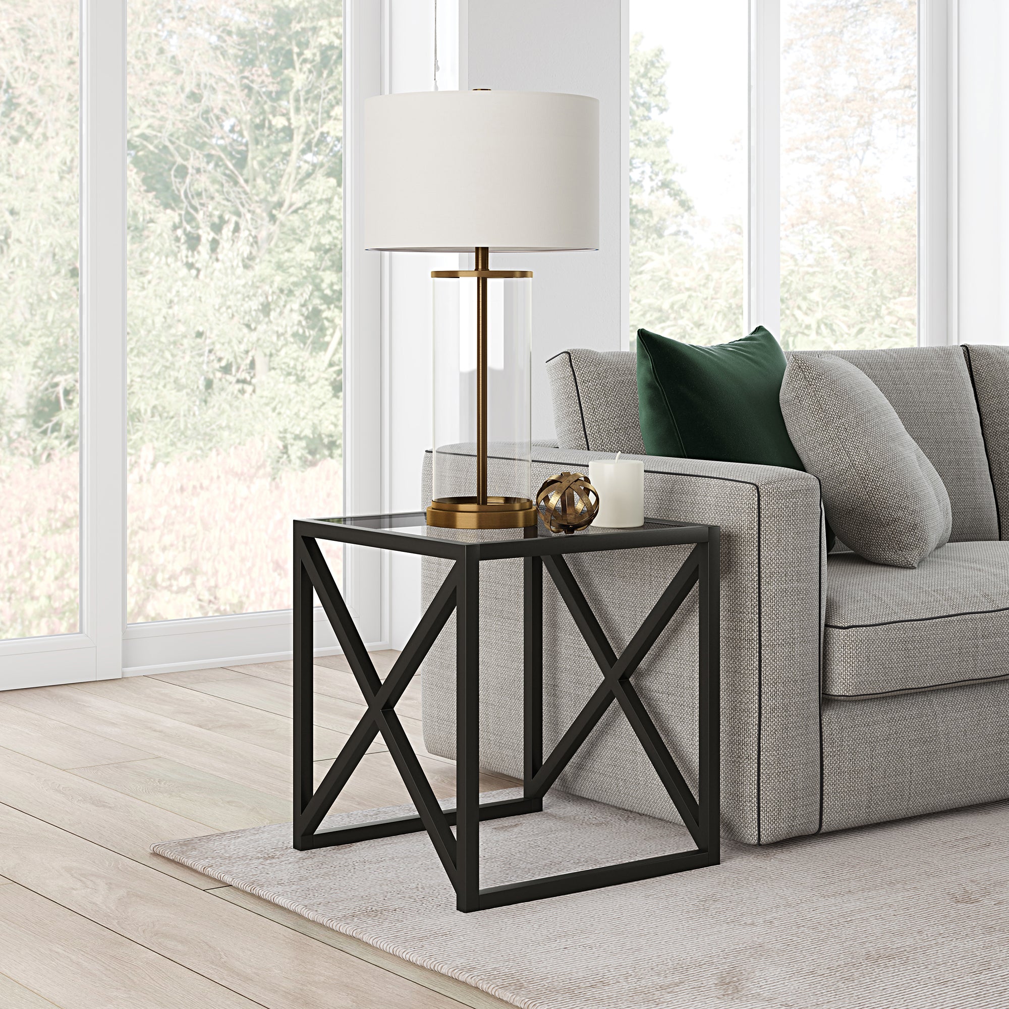 This urban inspired end table is the perfect pick for your living room or den ensemble. Its base features x-shaped legs creating geometric interest. The top is a transparent tempered glass which shows off the architectural connection and carries the structured design through the frame.
