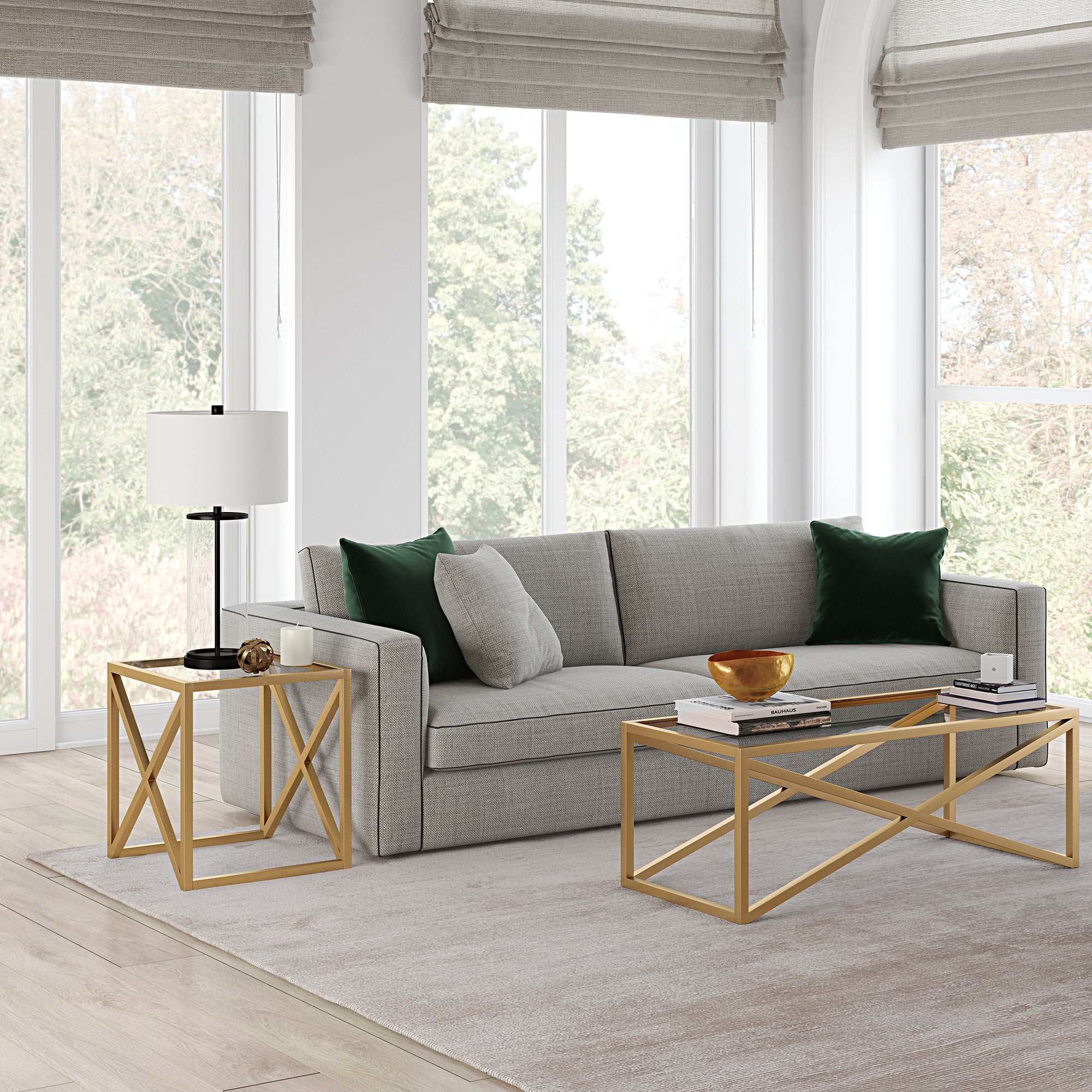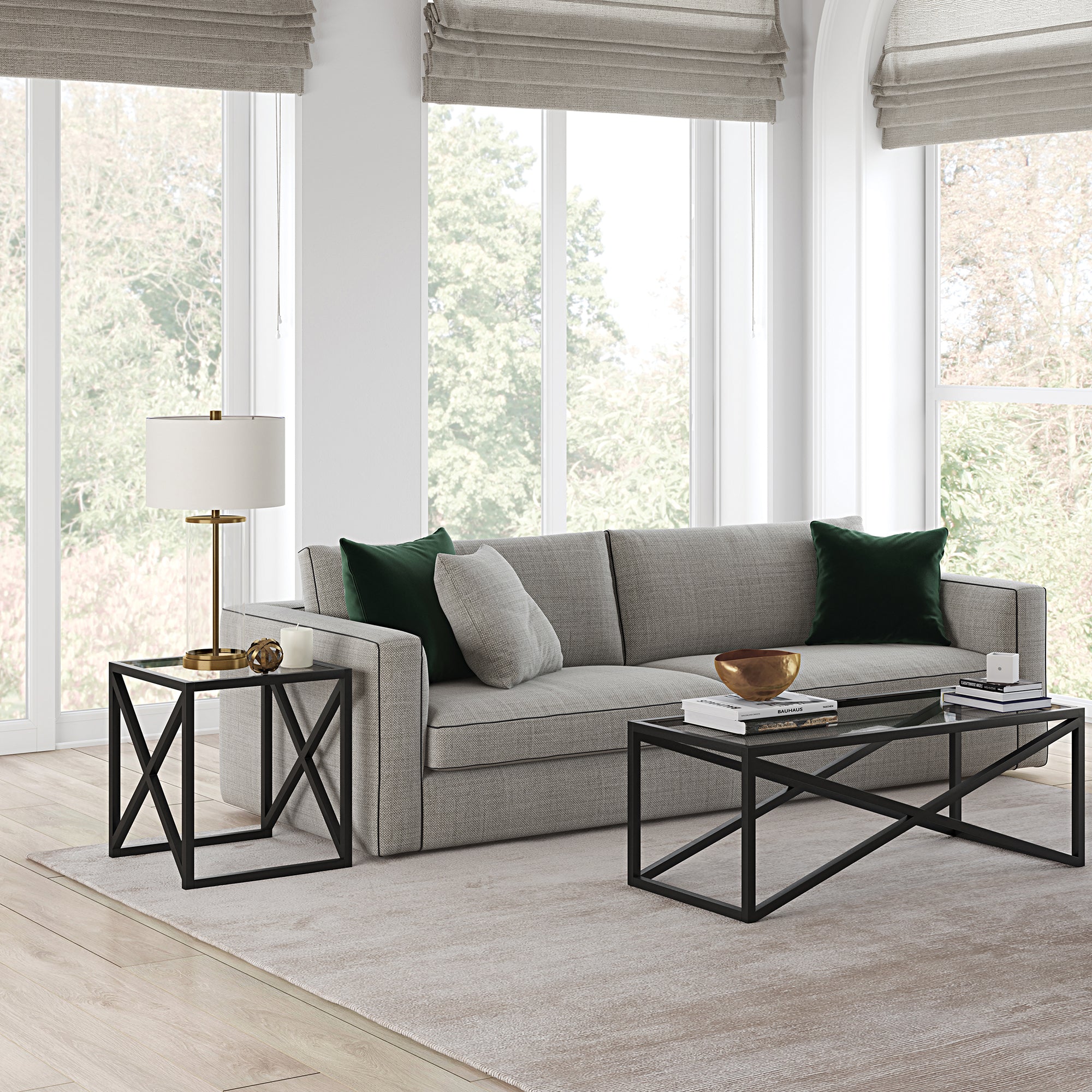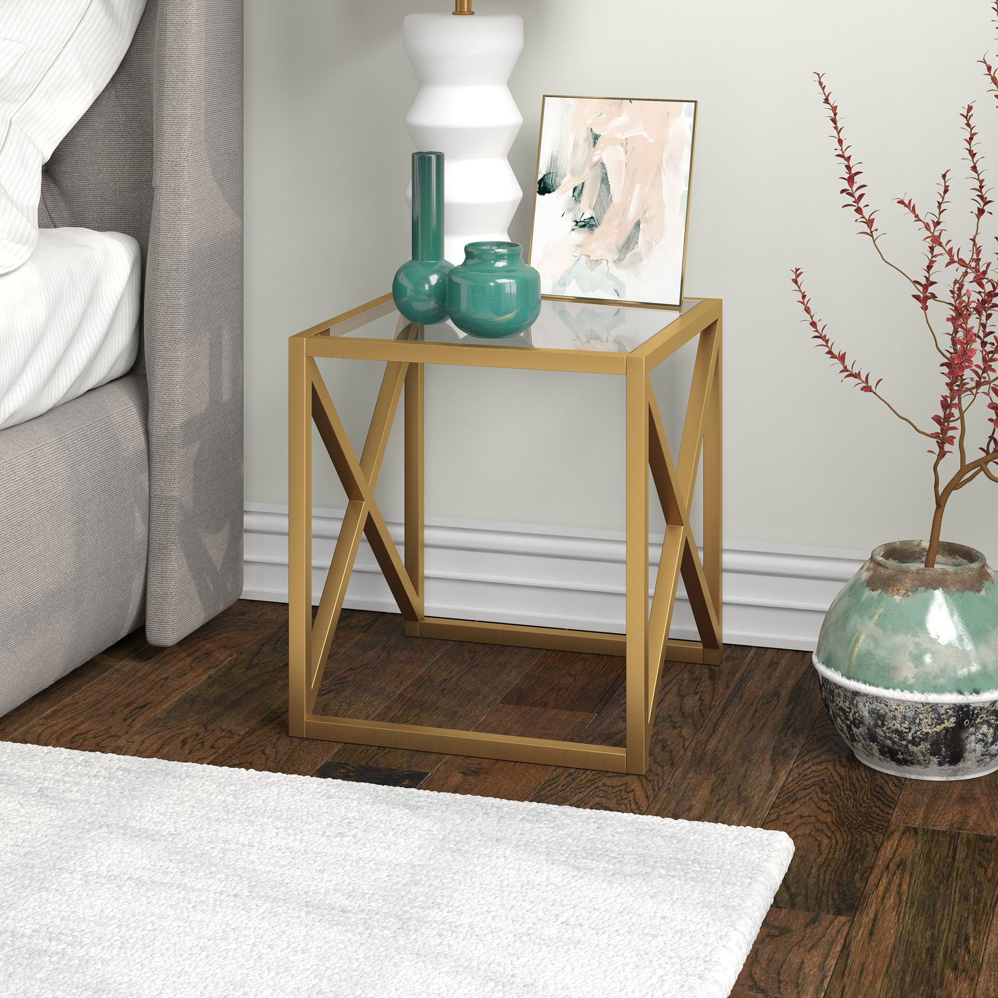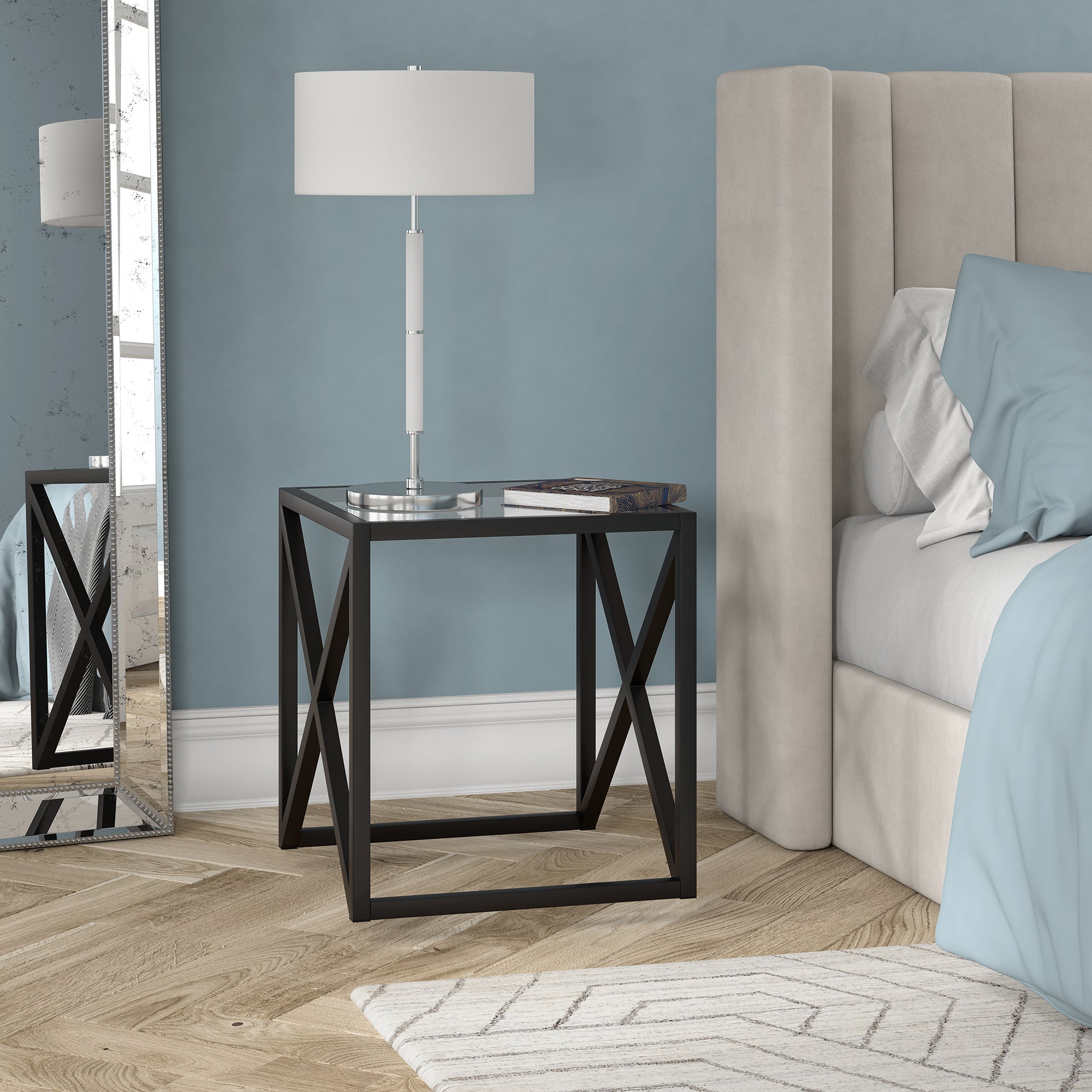 This urban inspired end table is the perfect pick for your living room or den ensemble. Its base features x-shaped legs creating geometric interest. The top is a transparent tempered glass which shows off the architectural connection and carries the structured design through the frame.