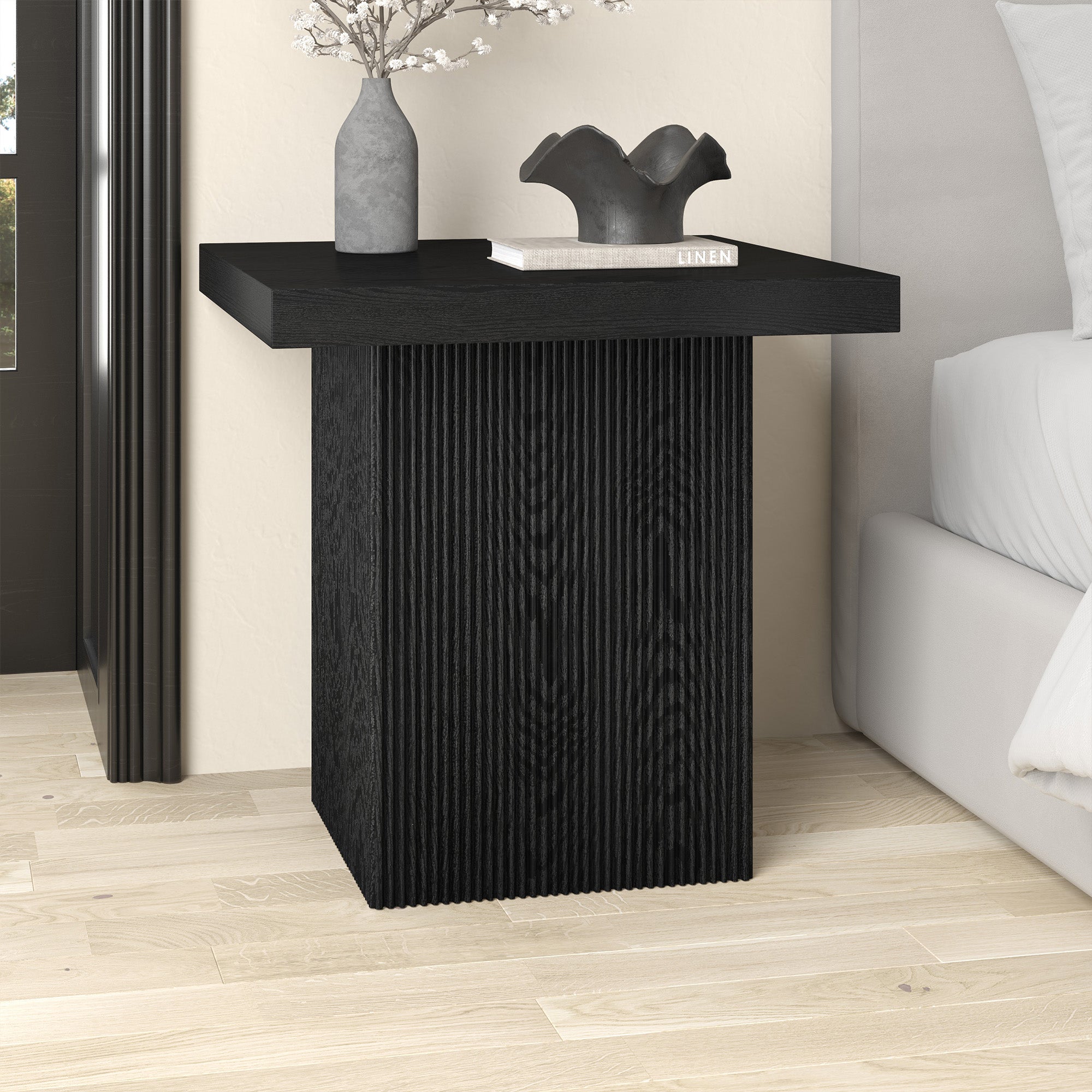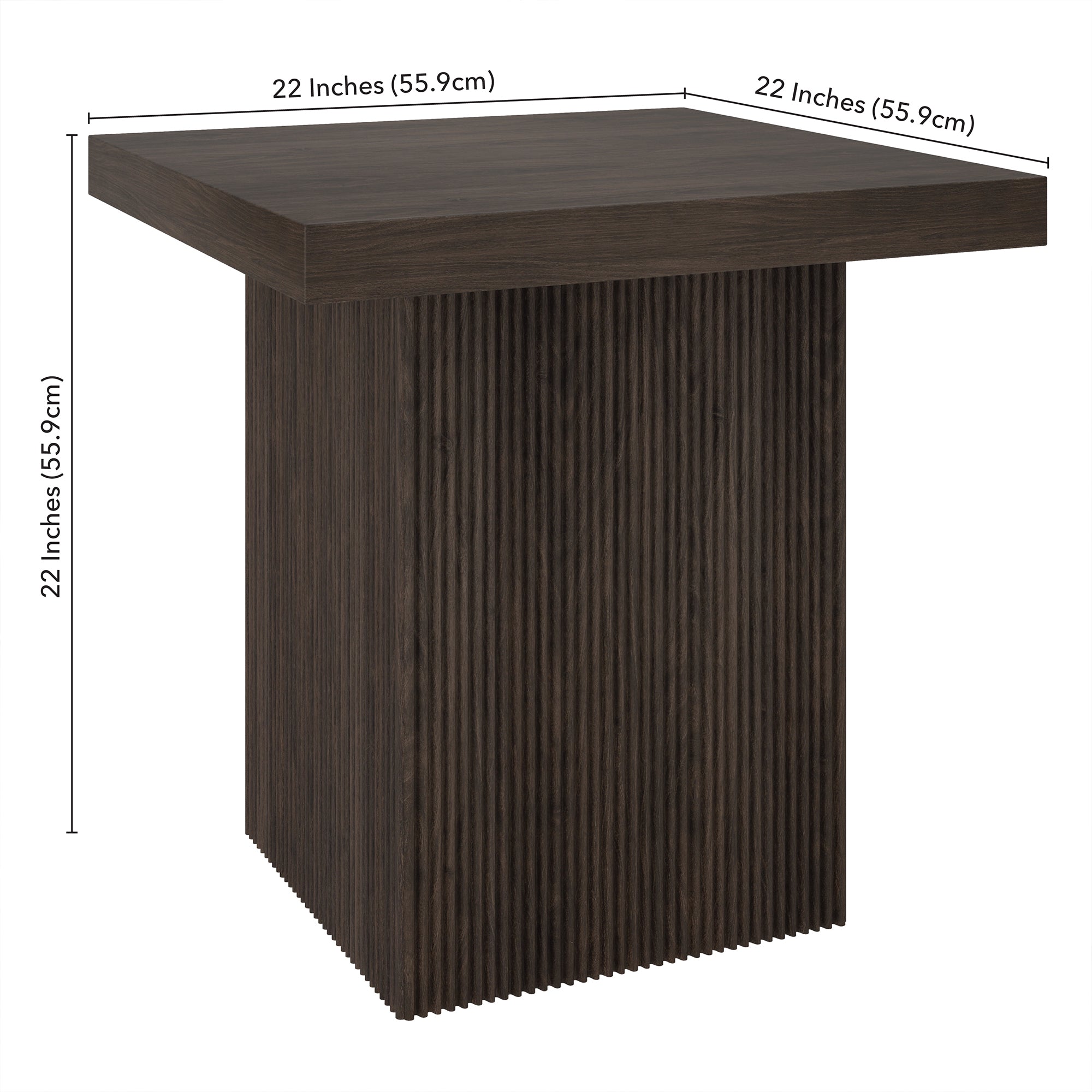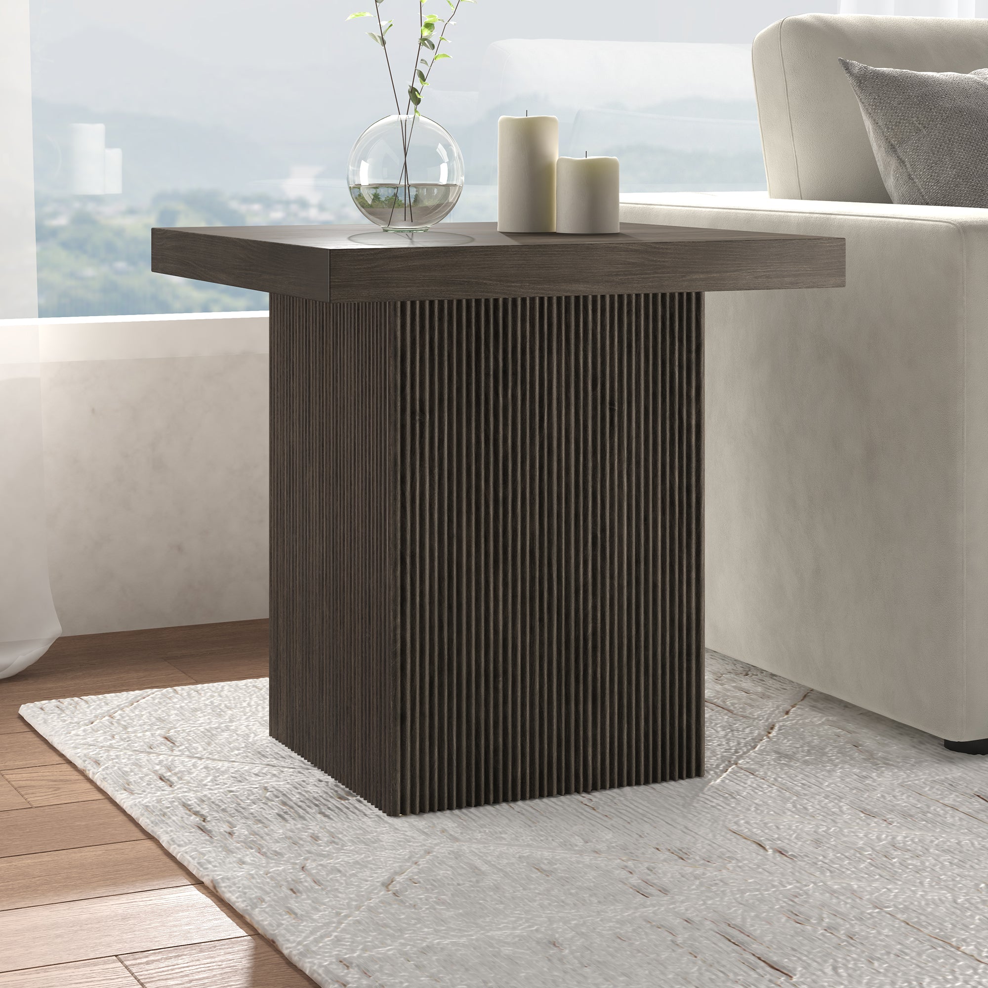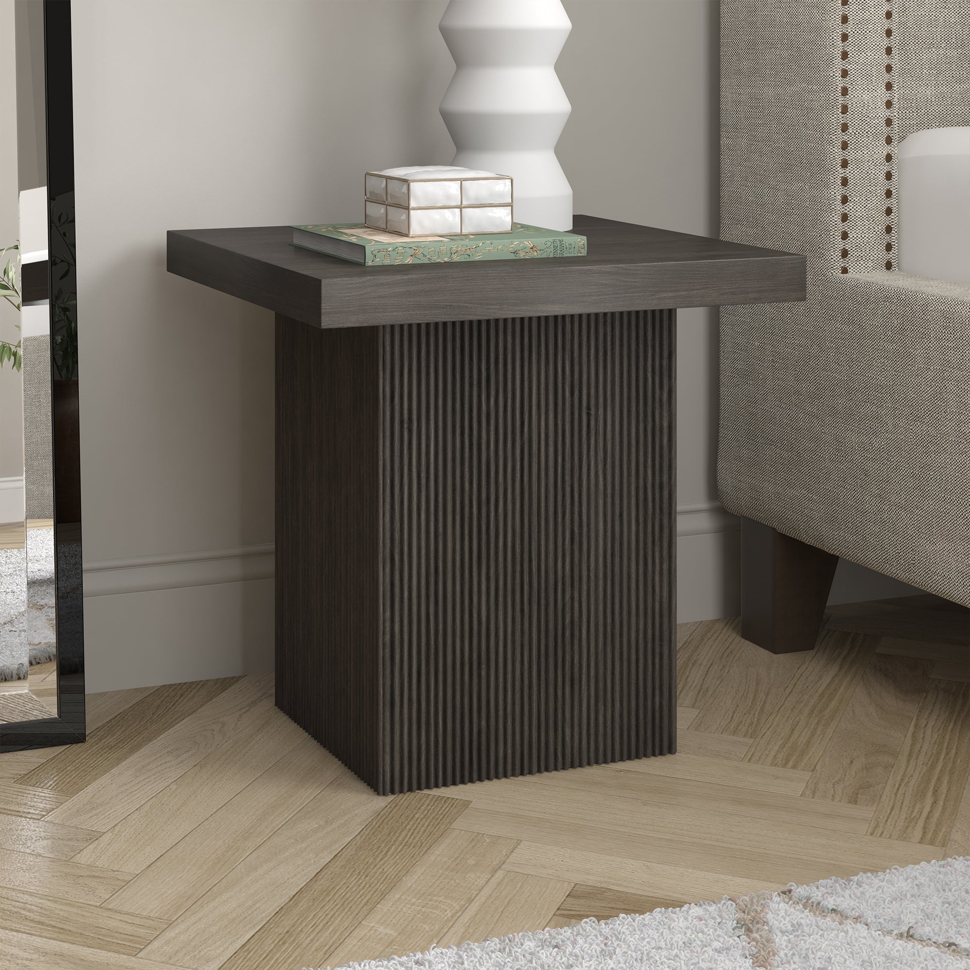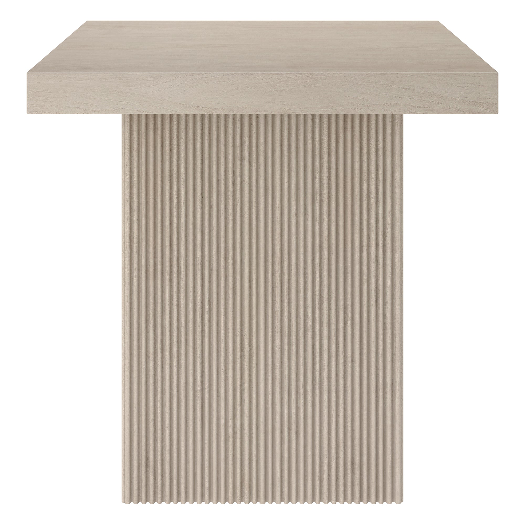 Striking in its simplicity, this modern side table emphasizes clean lines and straightforward design. The table's simple style is given extra dimension with the fluted detailing on the base. The natural wood-look finish adds texture and tonal variation to your space, while the solid base adds substance to the piece. With a weight capacity of up to 40 lbs, this is sure to be a durable addition to your living room, family room, or office.