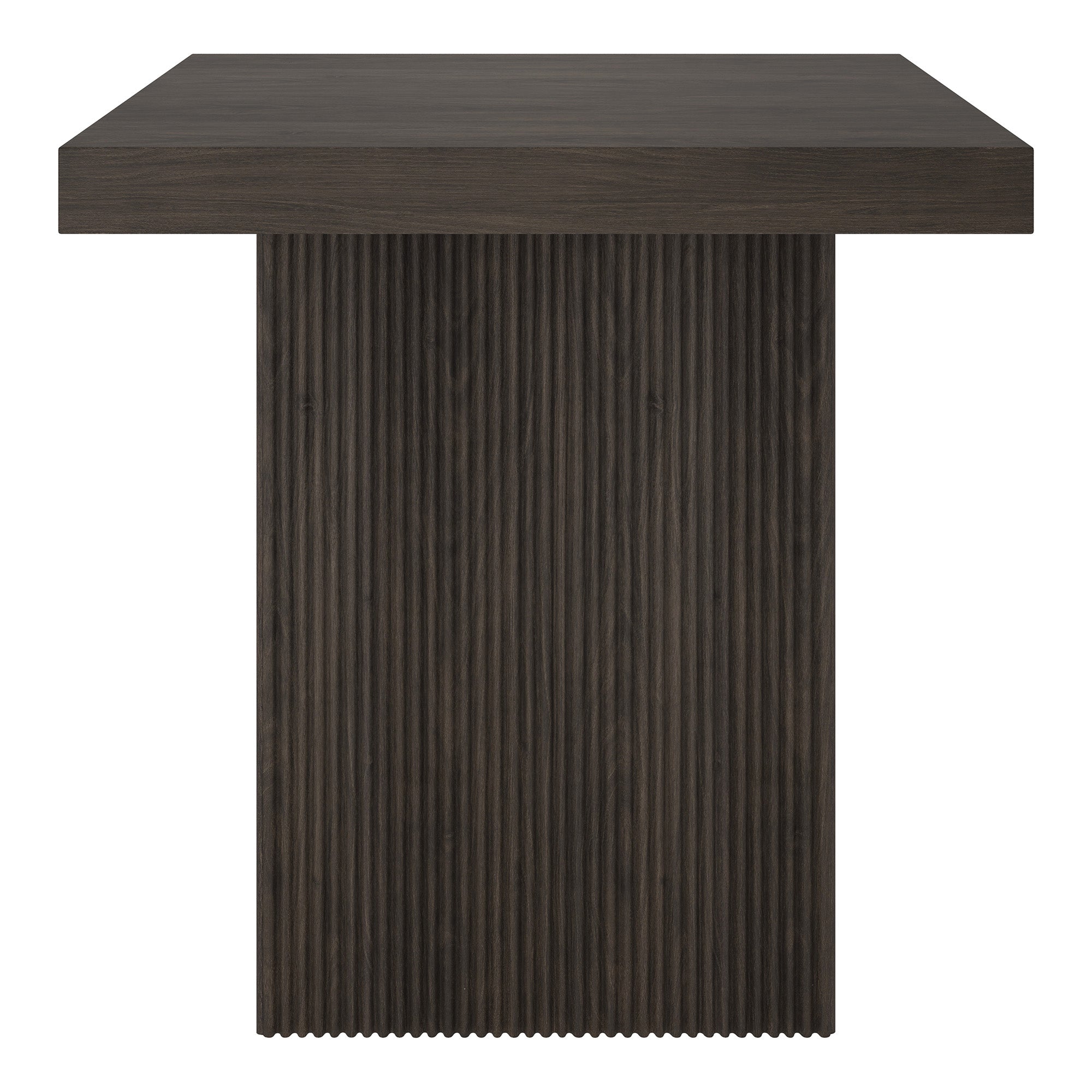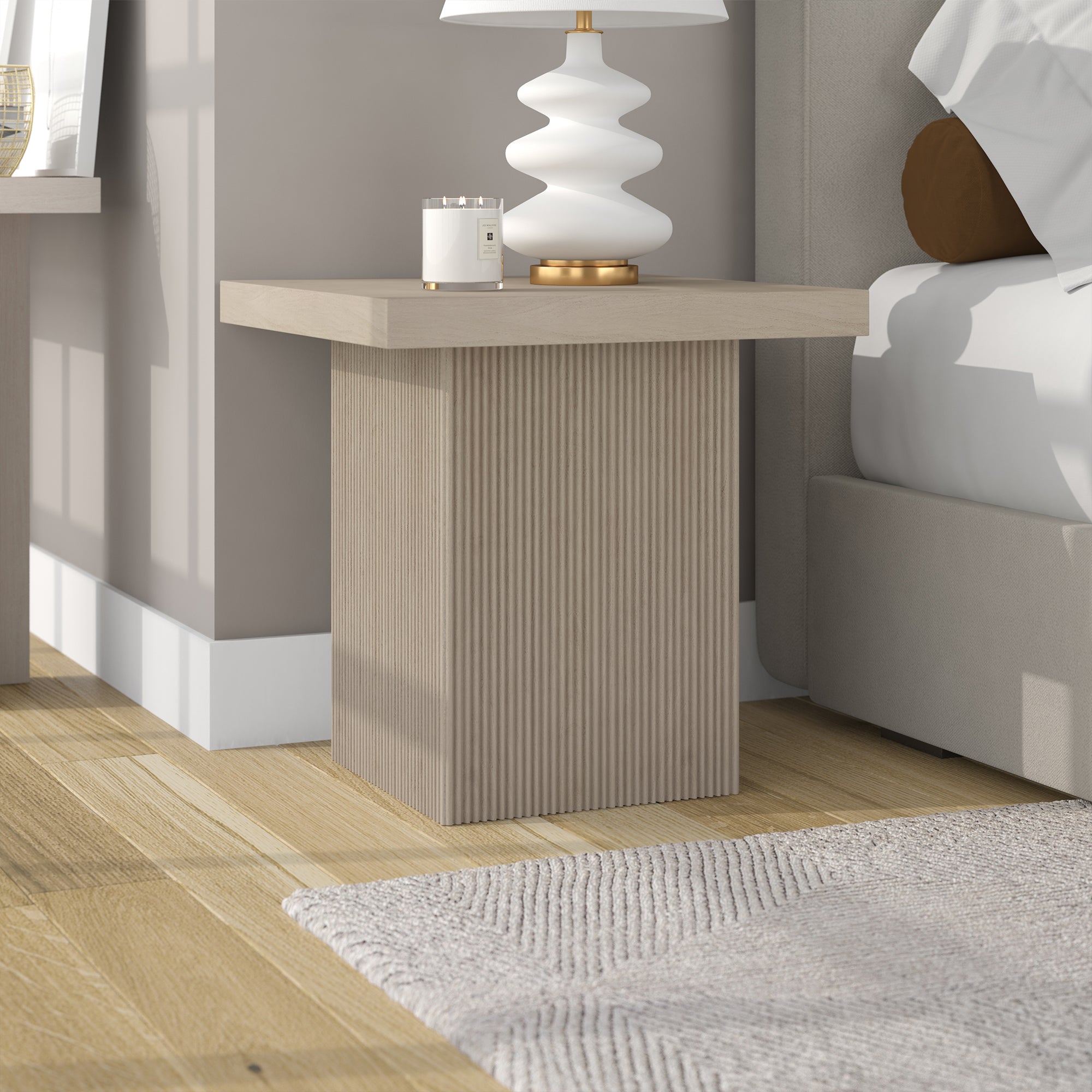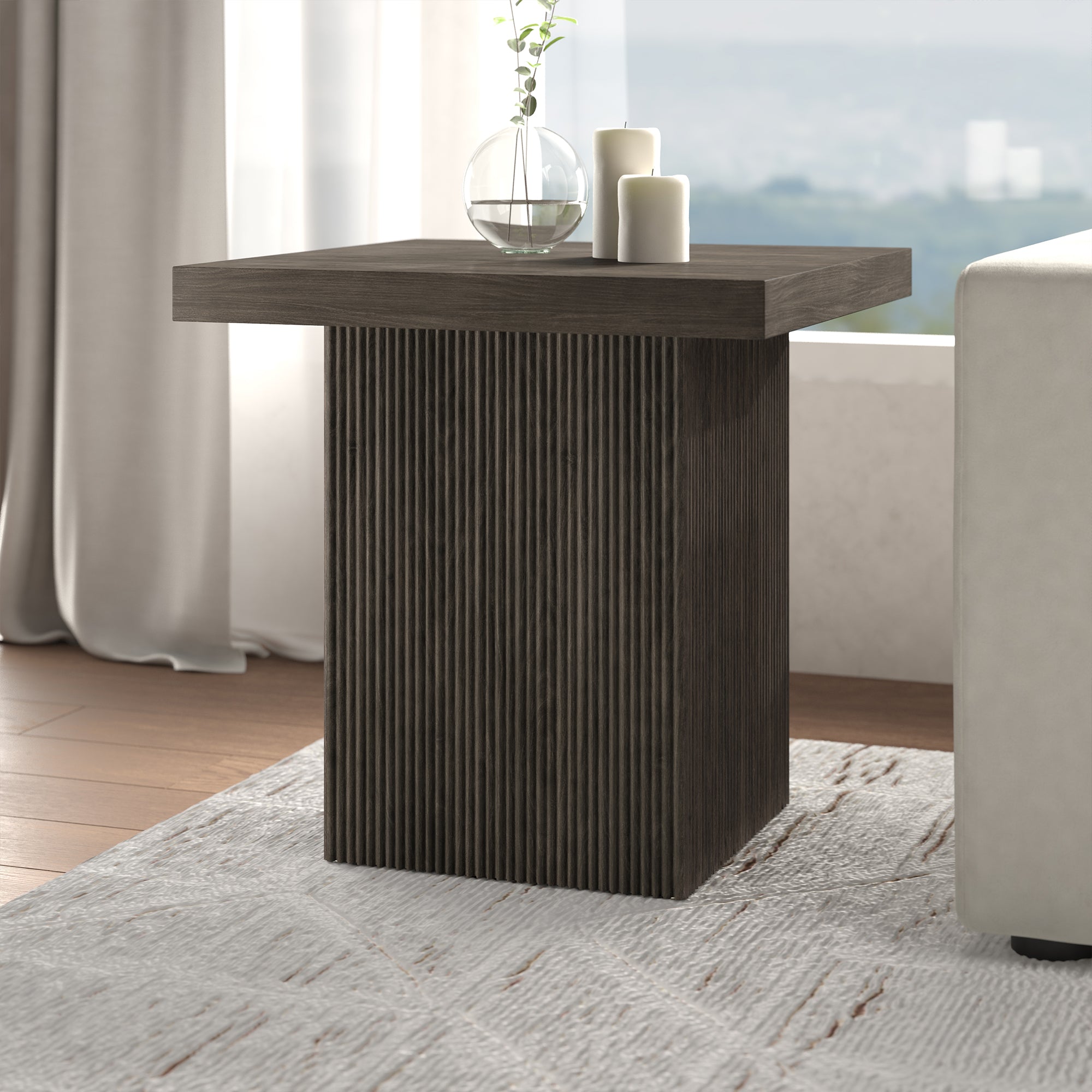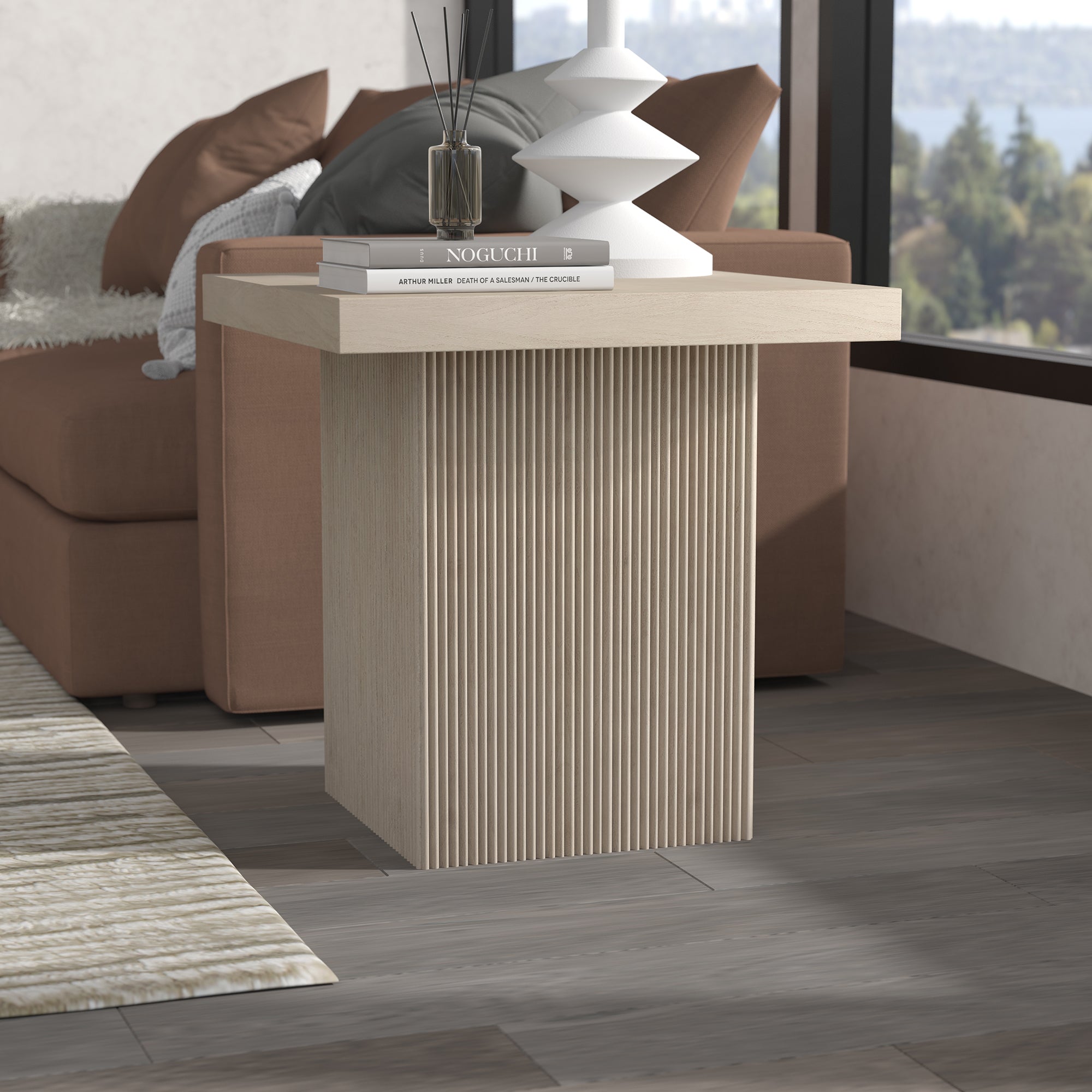 Striking in its simplicity, this modern side table emphasizes clean lines and straightforward design. The table's simple style is given extra dimension with the fluted detailing on the base. The natural wood-look finish adds texture and tonal variation to your space, while the solid base adds substance to the piece. With a weight capacity of up to 40 lbs, this is sure to be a durable addition to your living room, family room, or office.