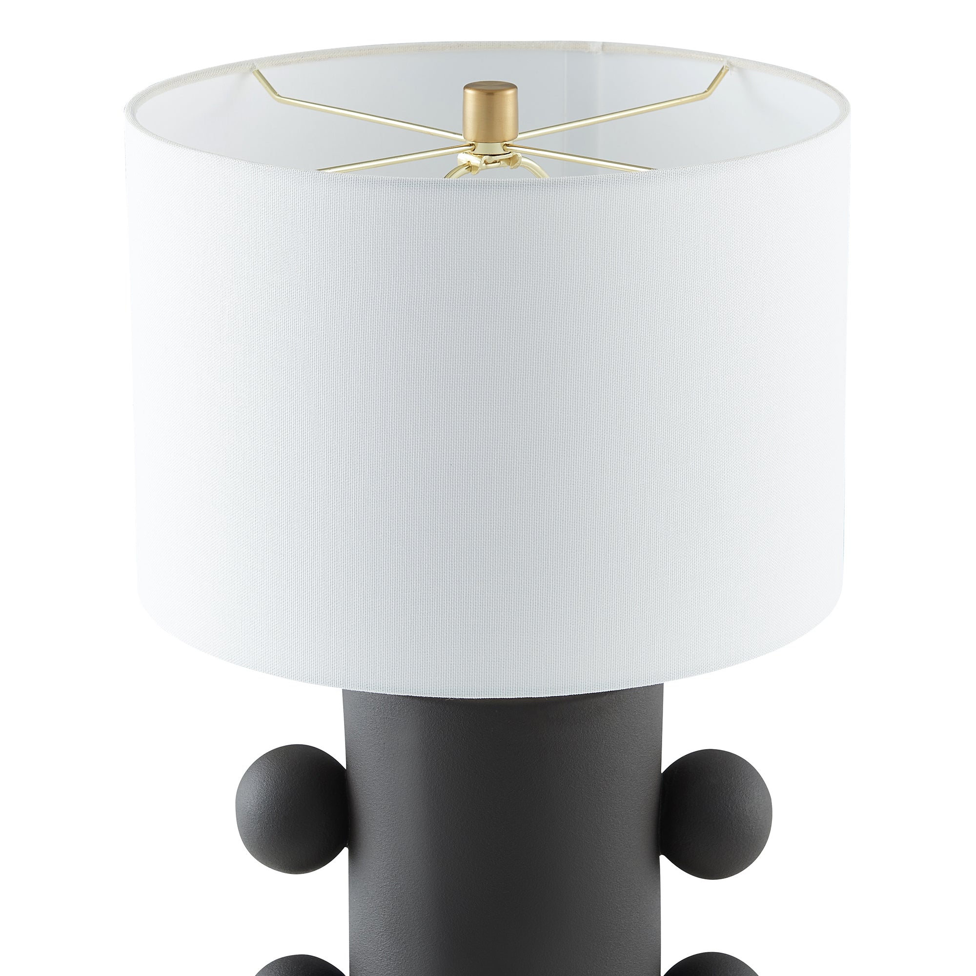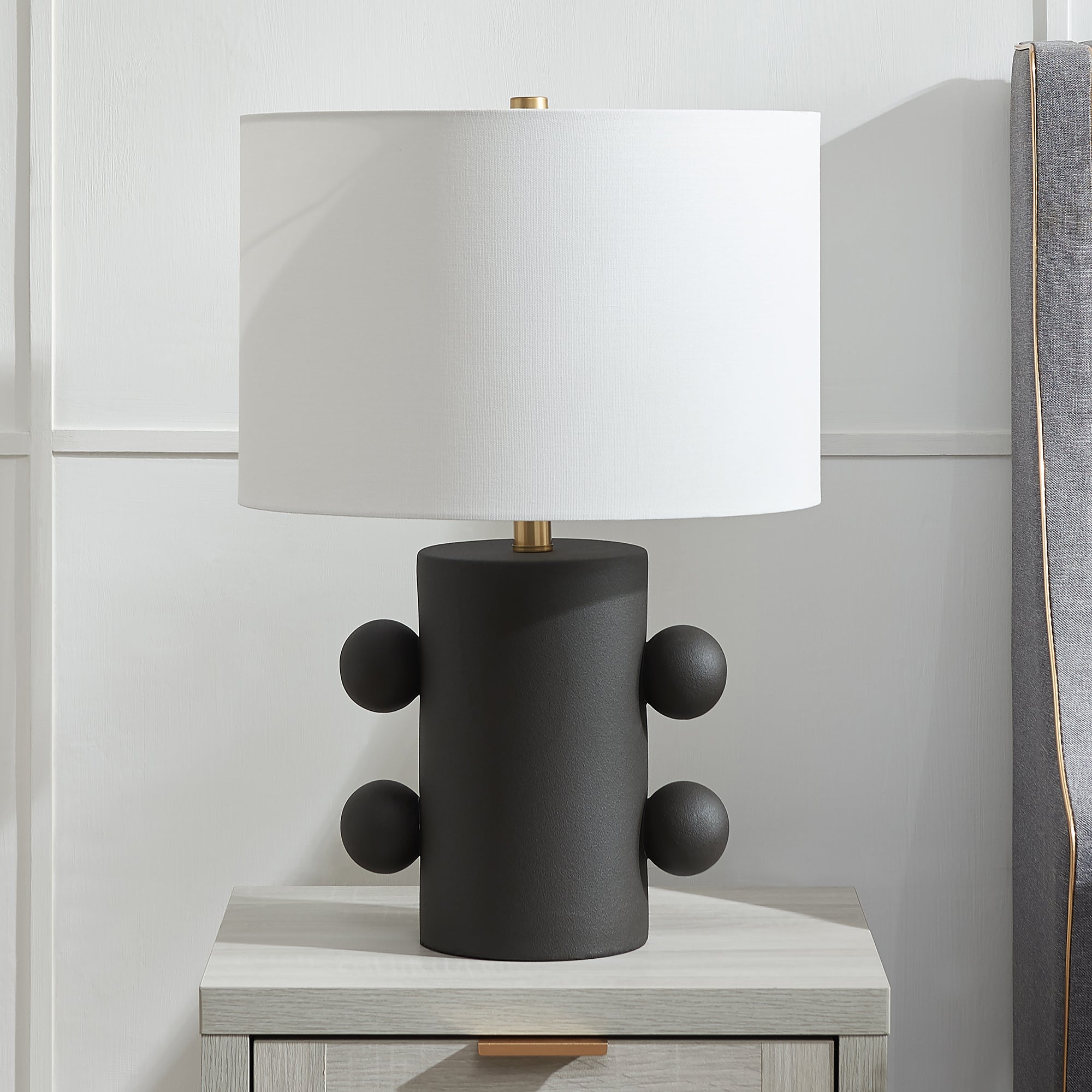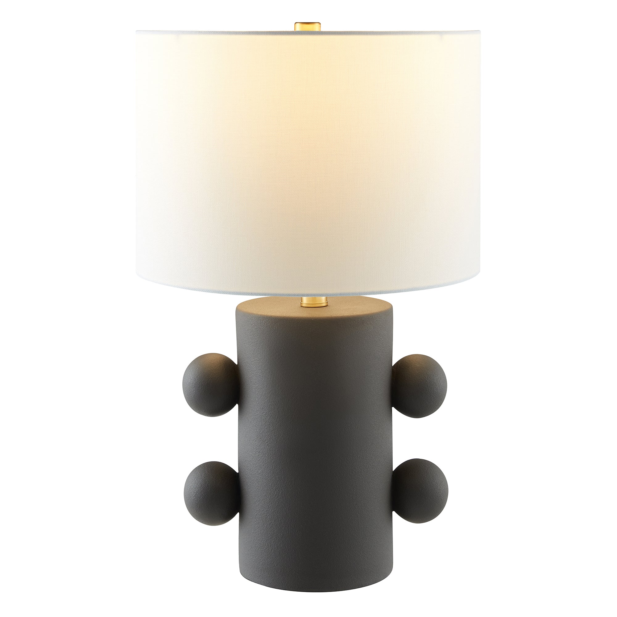 The bold silhouette of this petite 20" tall table lamp is sure to become a focal point in your living room, bedroom, or workspace. The gently curved lines of the matte ceramic body are punctuated with spherical orbs on each side, creating a textured, sculptural look. The fixture is finished off with a simple drum shade, allowing the unique shape of the base to remain the star of the show. Create a striking style moment in any room!