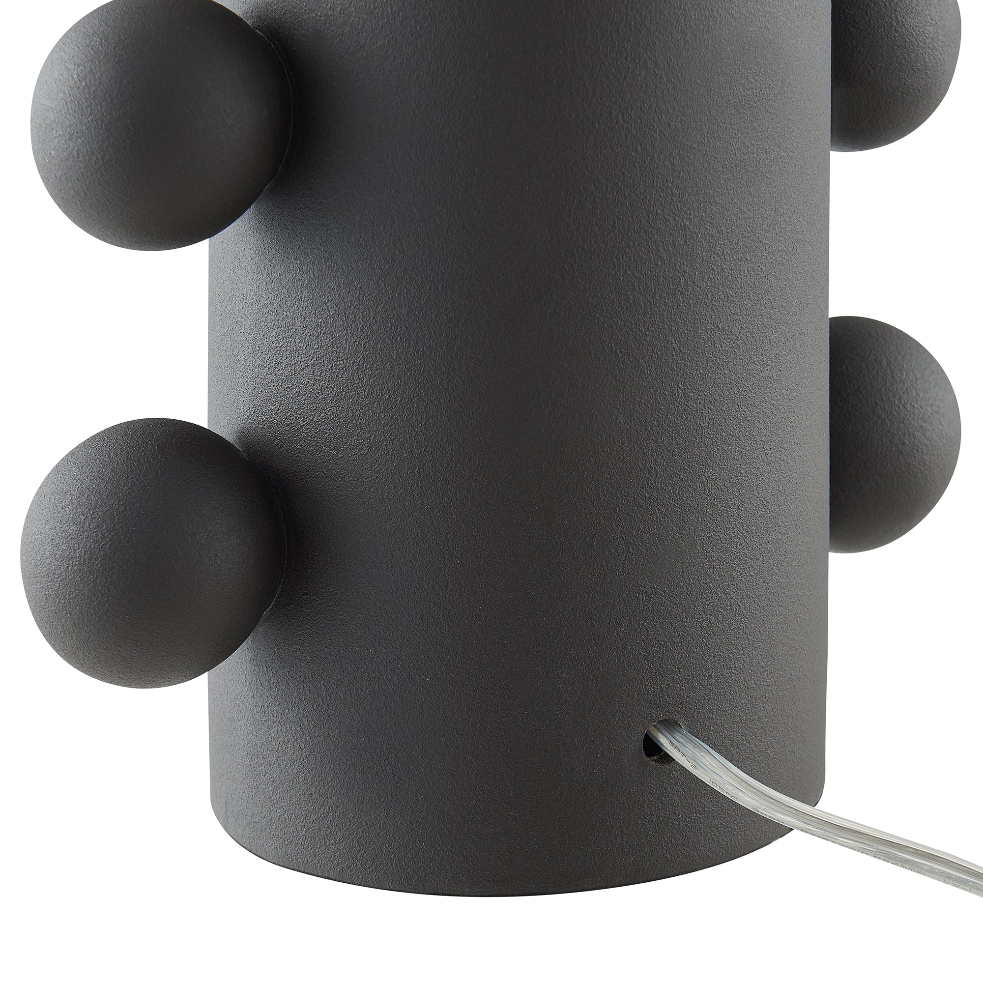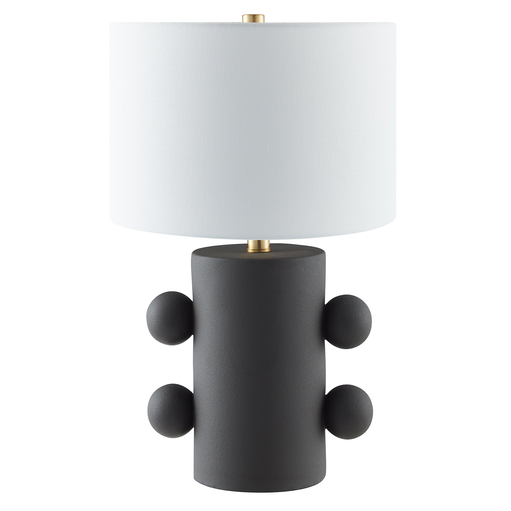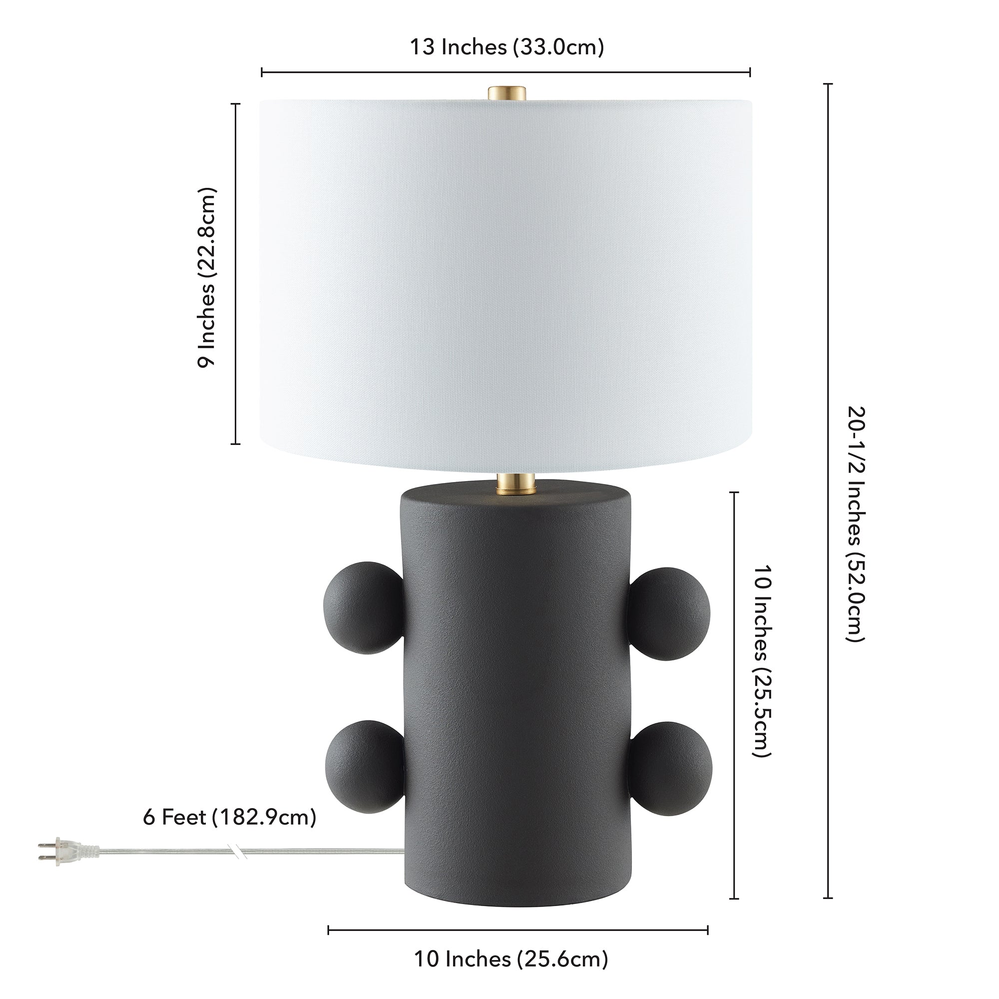 The bold silhouette of this petite 20" tall table lamp is sure to become a focal point in your living room, bedroom, or workspace. The gently curved lines of the matte ceramic body are punctuated with spherical orbs on each side, creating a textured, sculptural look. The fixture is finished off with a simple drum shade, allowing the unique shape of the base to remain the star of the show. Create a striking style moment in any room!