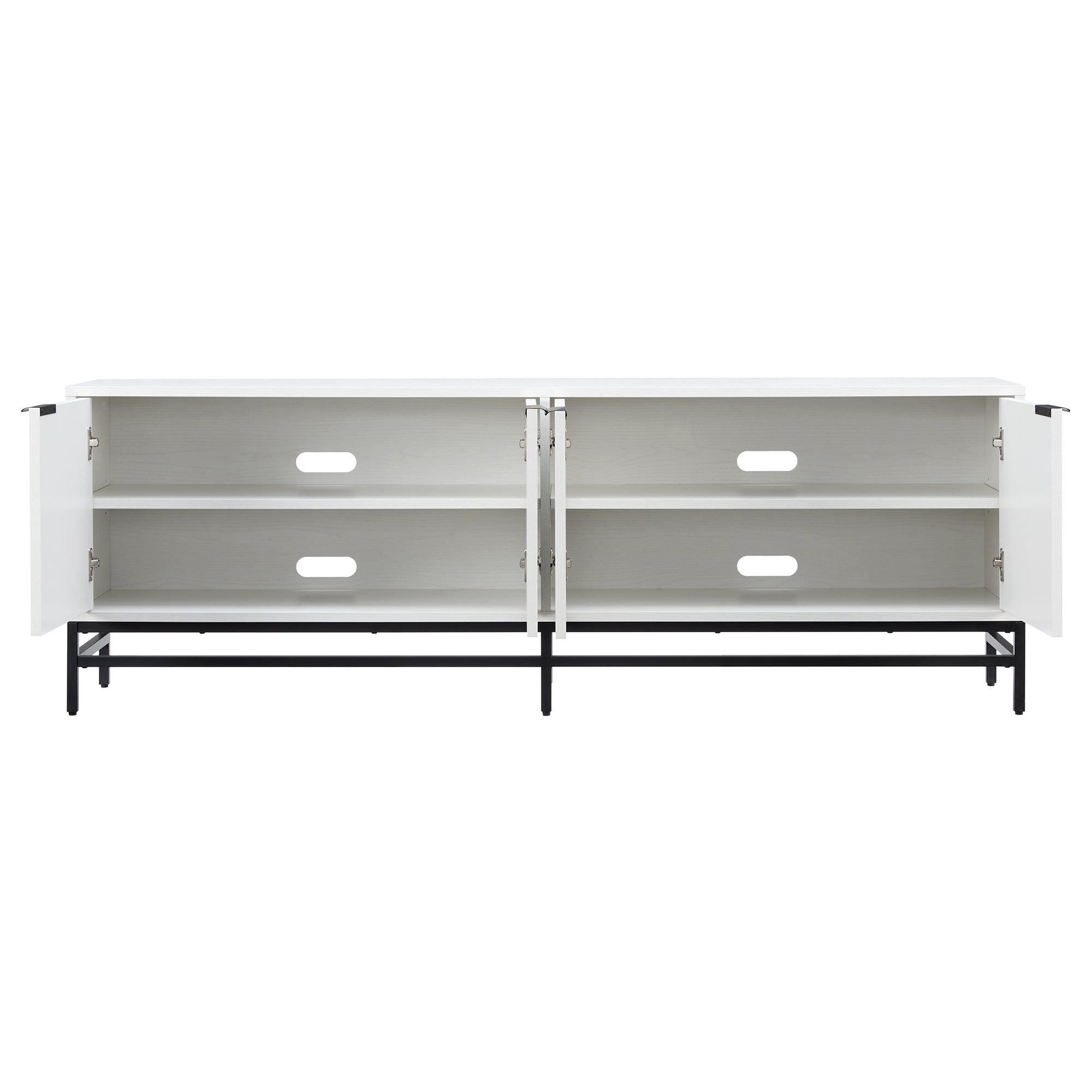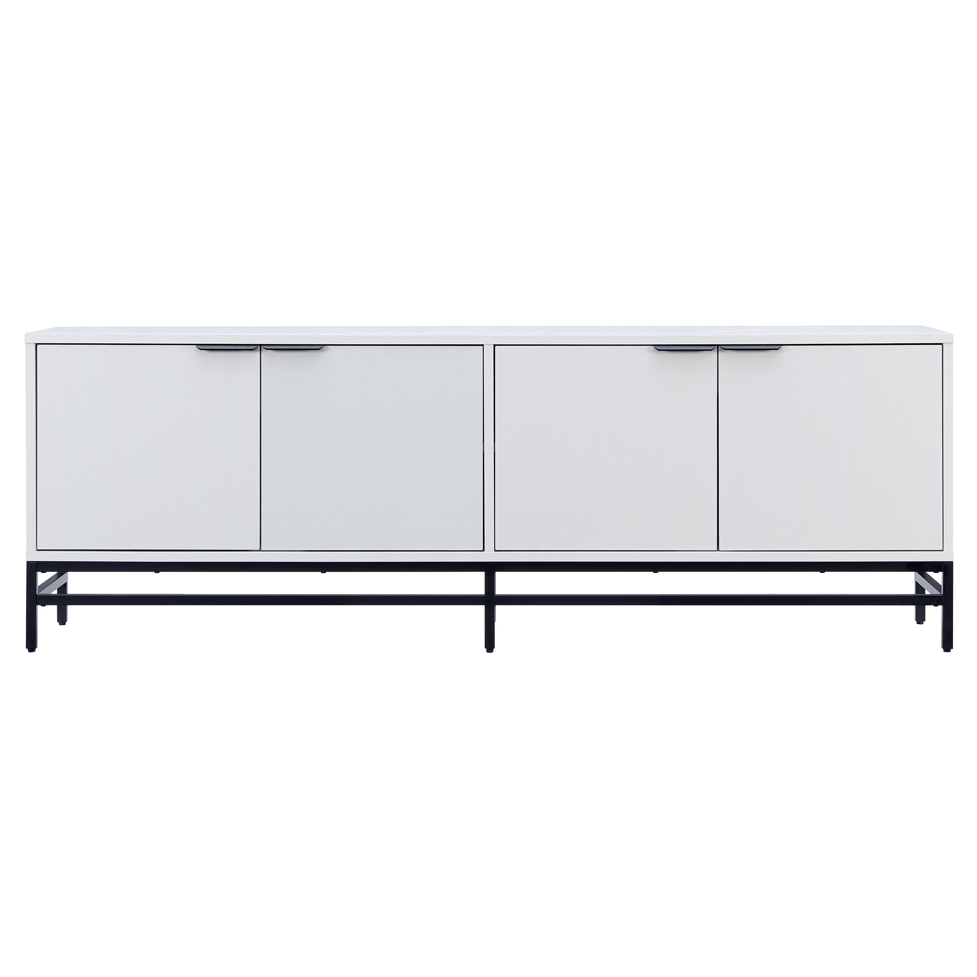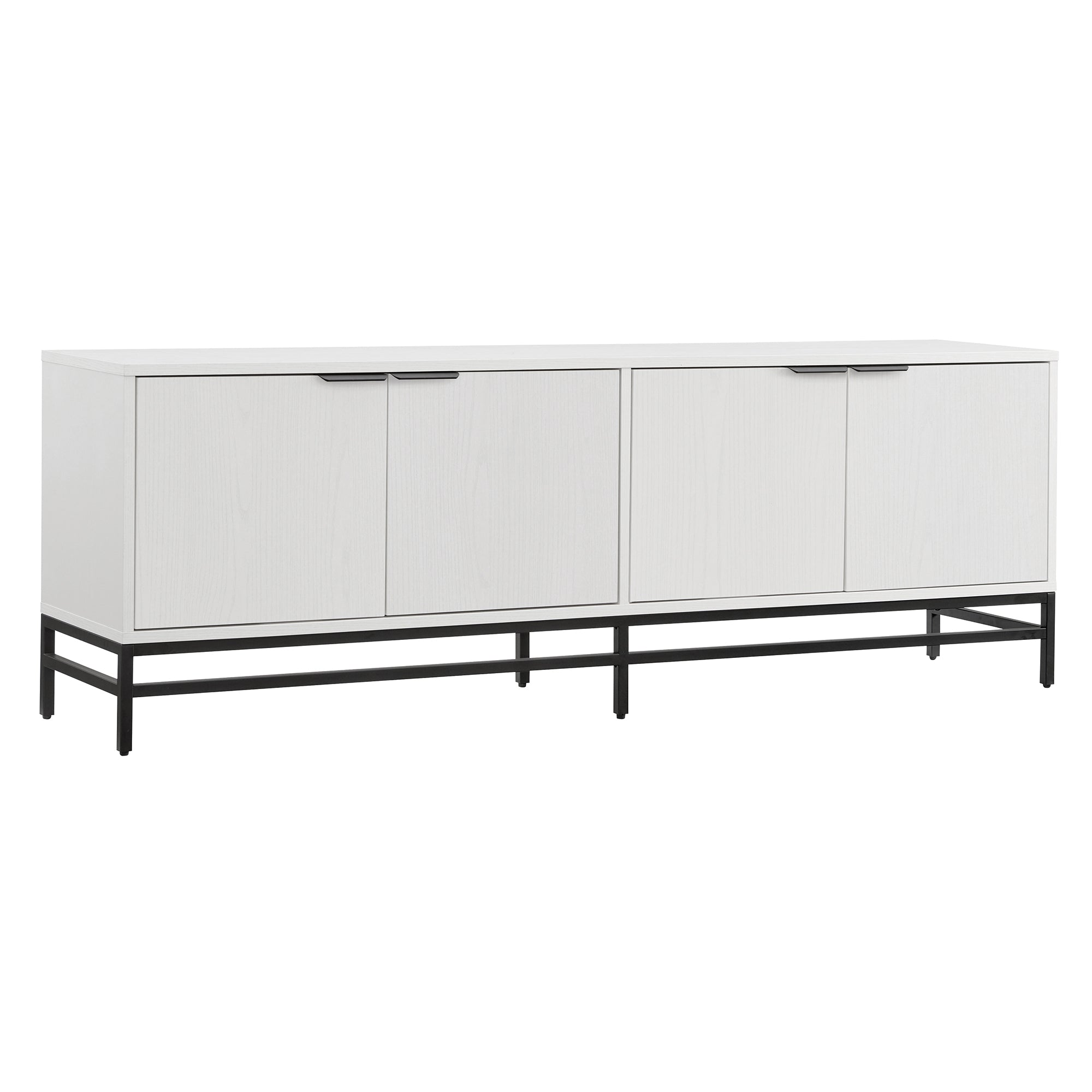 On-trend mixed material design is on display with this modern TV stand. With a wood grain finish and sleek metal base, this piece is perfect for your mid-century or minimalist-inspired living room, den, or game room. It's low 24" height leaves plenty of room above for an oversized wall-mounted TV or set of statement lamps. This stand features cable-management cut-outs and 4 fully enclosed doors with top-aligned hardware matching the base, allowing for stylish storage of your devices, games, books, and more. Leveling feet and adjustable door hinges ensure that everything sits just right for your space.