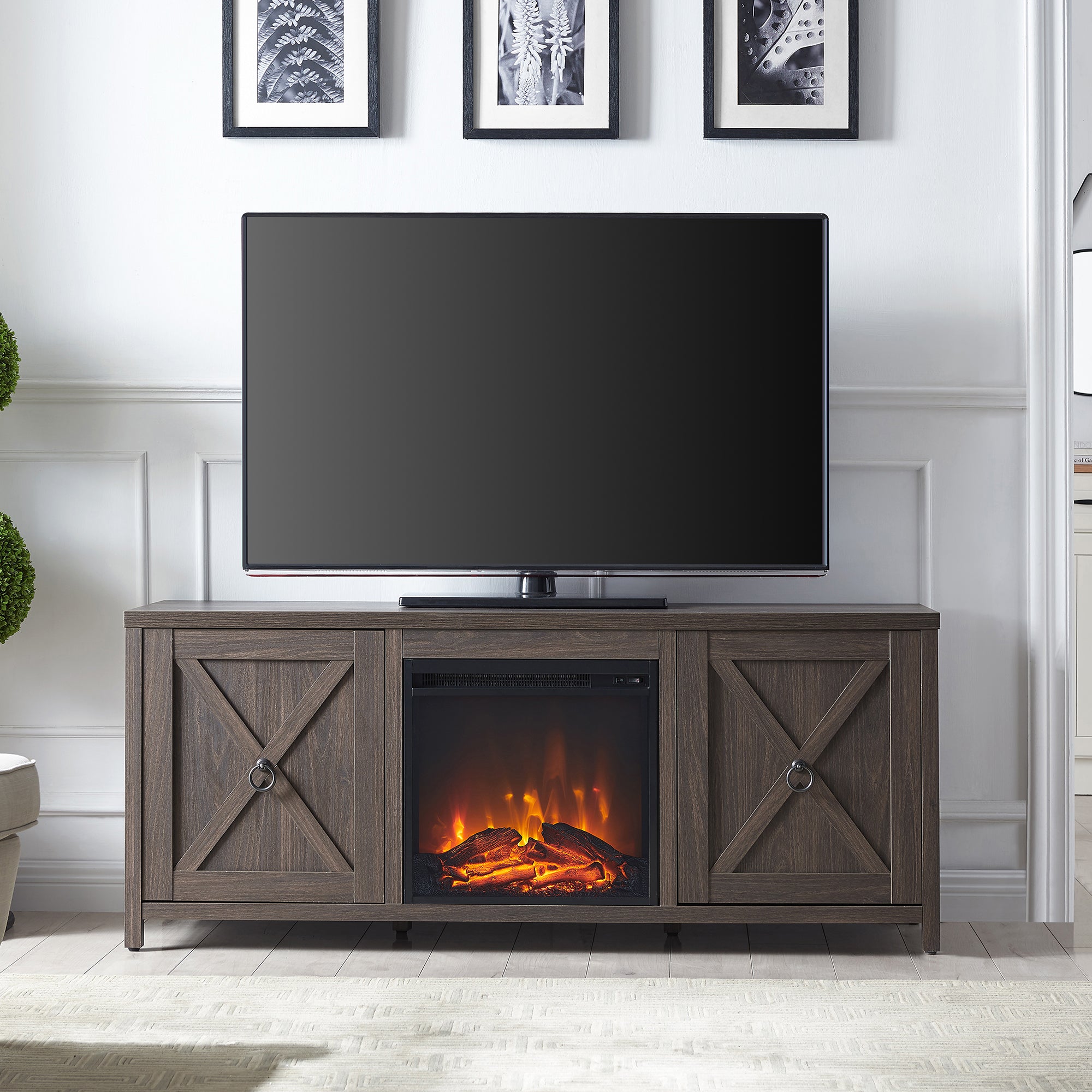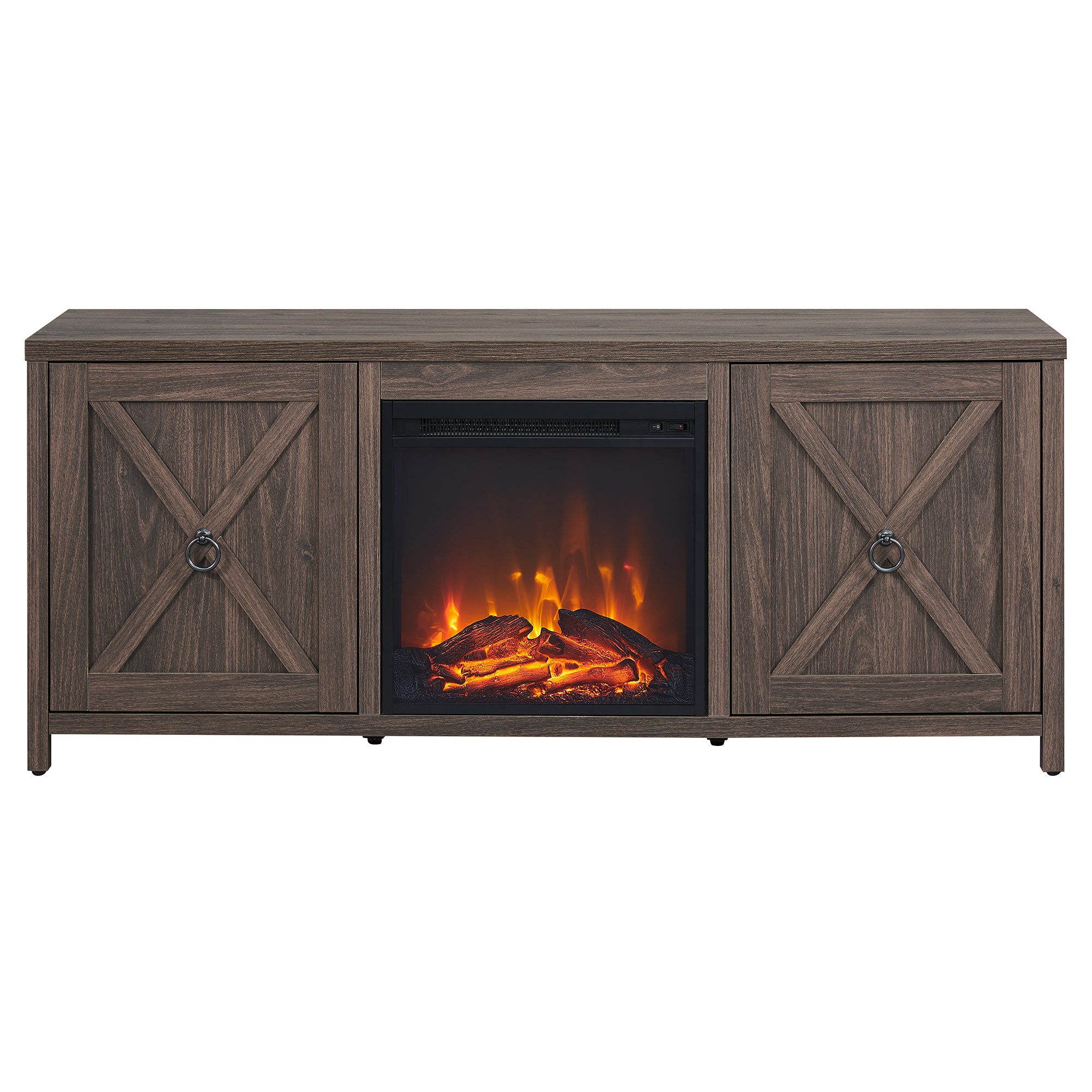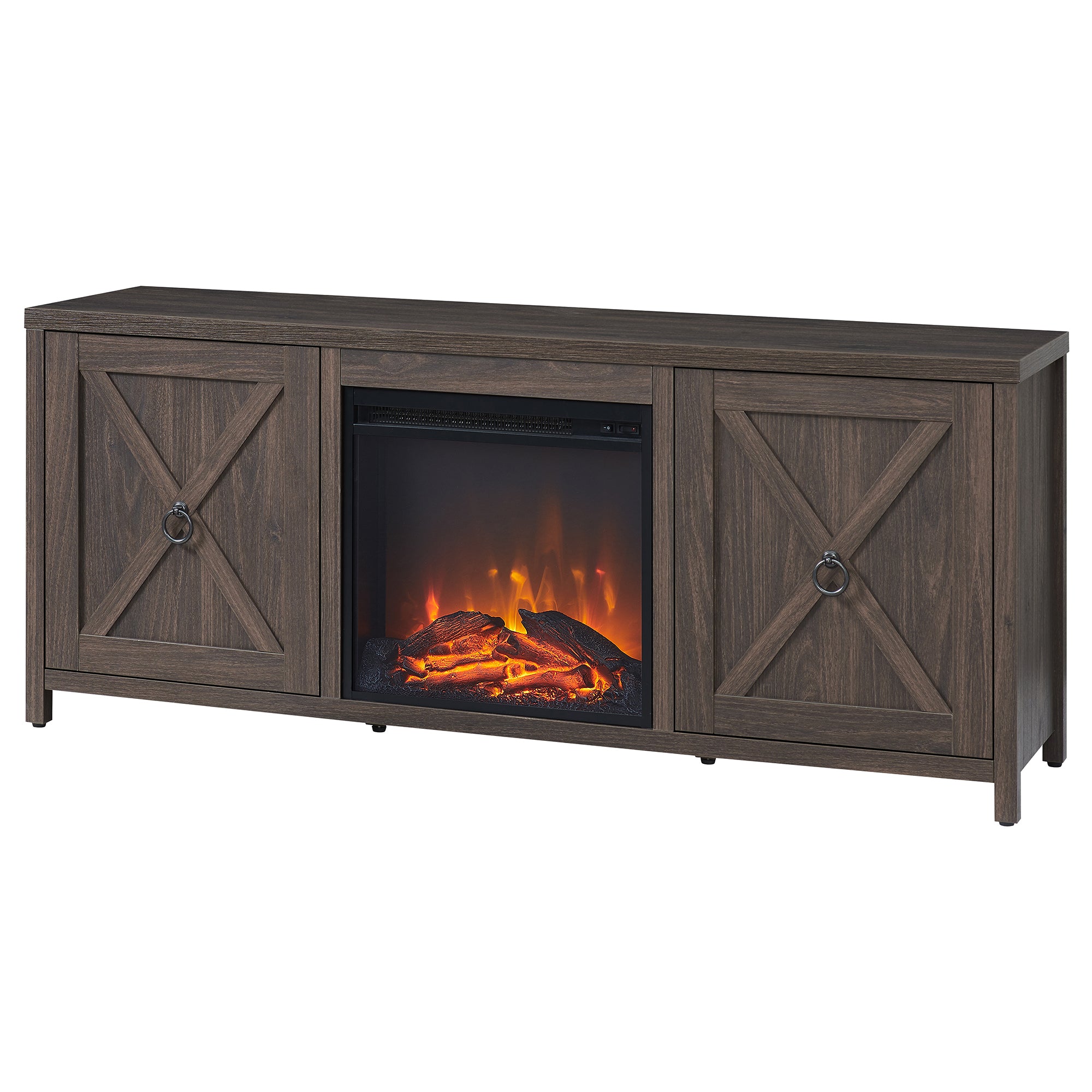 Combine functionality and classic modern farmhouse design with this sturdy TV stand, featuring an inset electric fireplace. Its rich wood tone creates a warm neutral palette that will blend seamlessly into any color scheme, while its side cabinets allow for plenty of hidden storage. Stay warm and cozy while you take in the big game, a movie marathon, or that season finale everyone’s been talking about.
