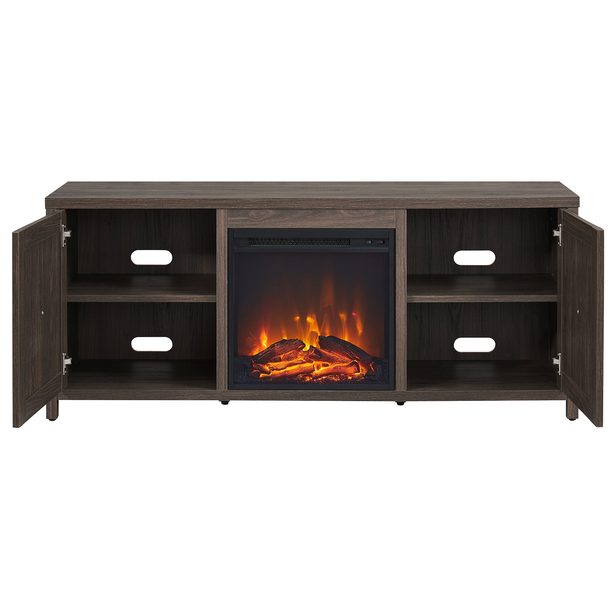 - Features an electric fireplace with wood-look logs, with 4 shelves and 2 enclosed doors for ample storage.