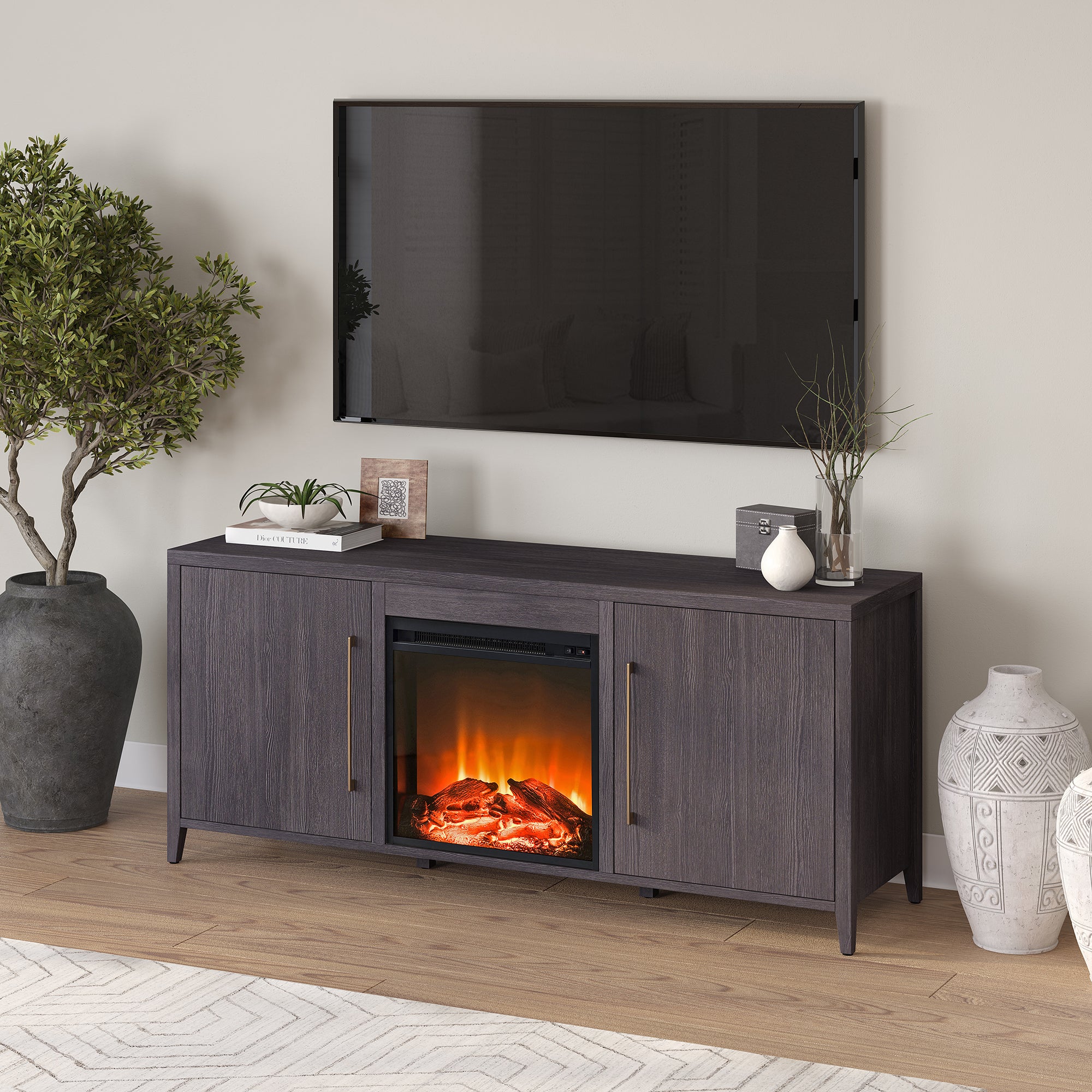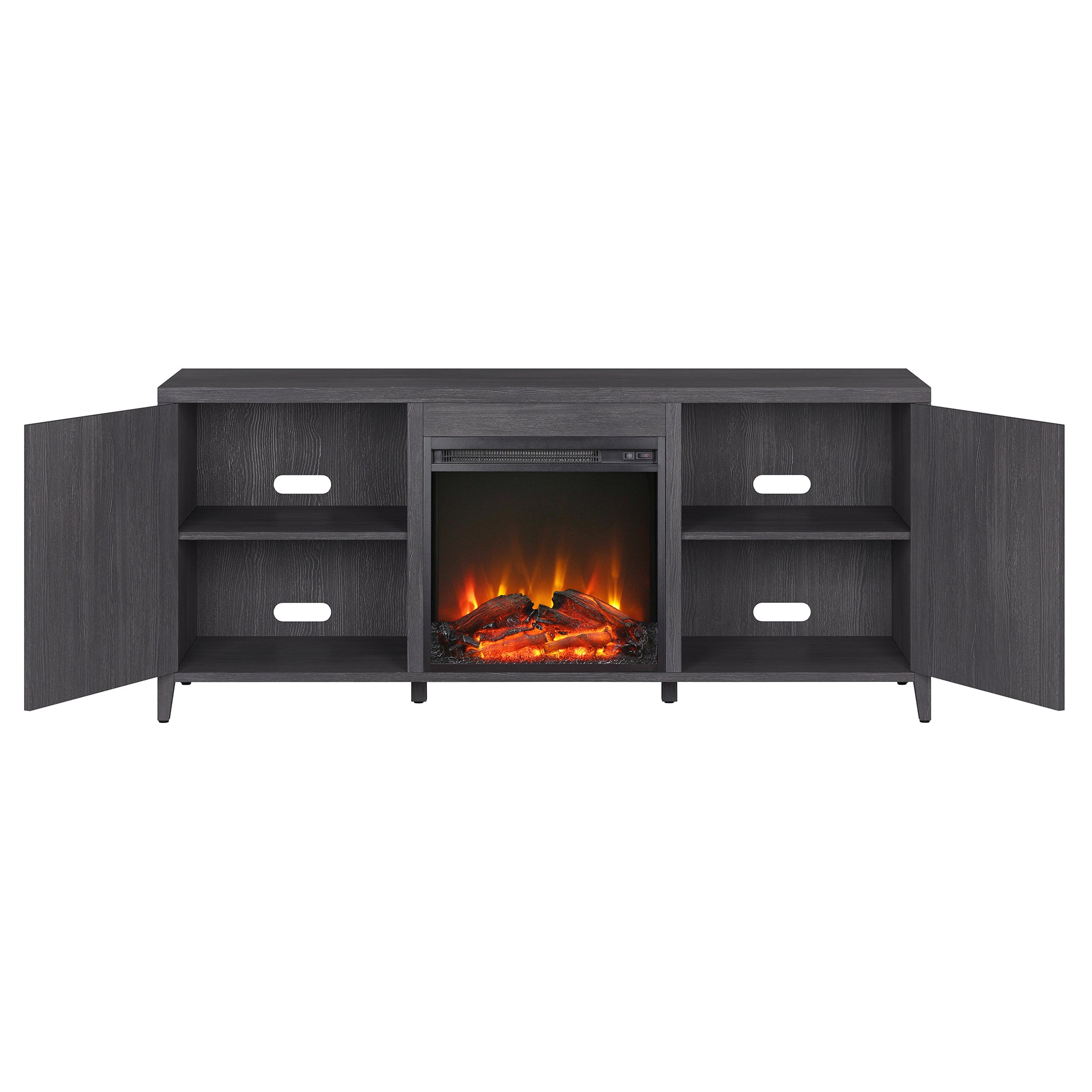 - Features an electric fireplace with wood-look logs, with 4 shelves and 2 enclosed doors for ample storage.