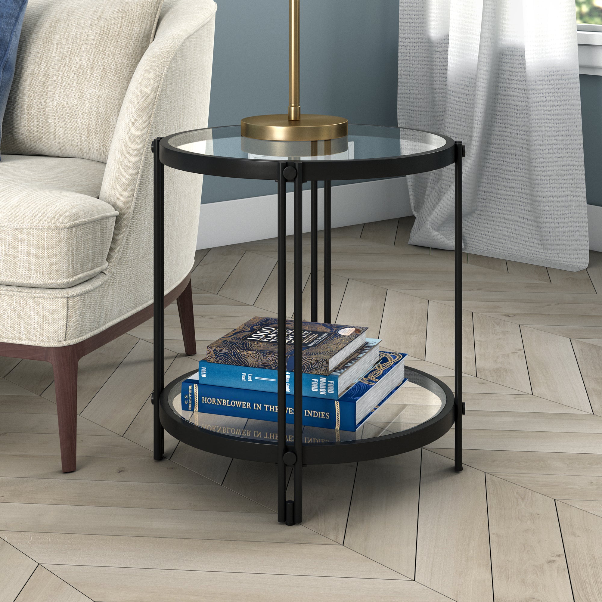 Complete your living room or bedroom ensemble in modern style with this contemporary side table. Crafted of premium steel and offered in a luminous metallic finish, this end table features a clean-lined round silhouette on four double-barred legs. The lower glass shelf is perfect for storing books, magazines, or decorative items.
