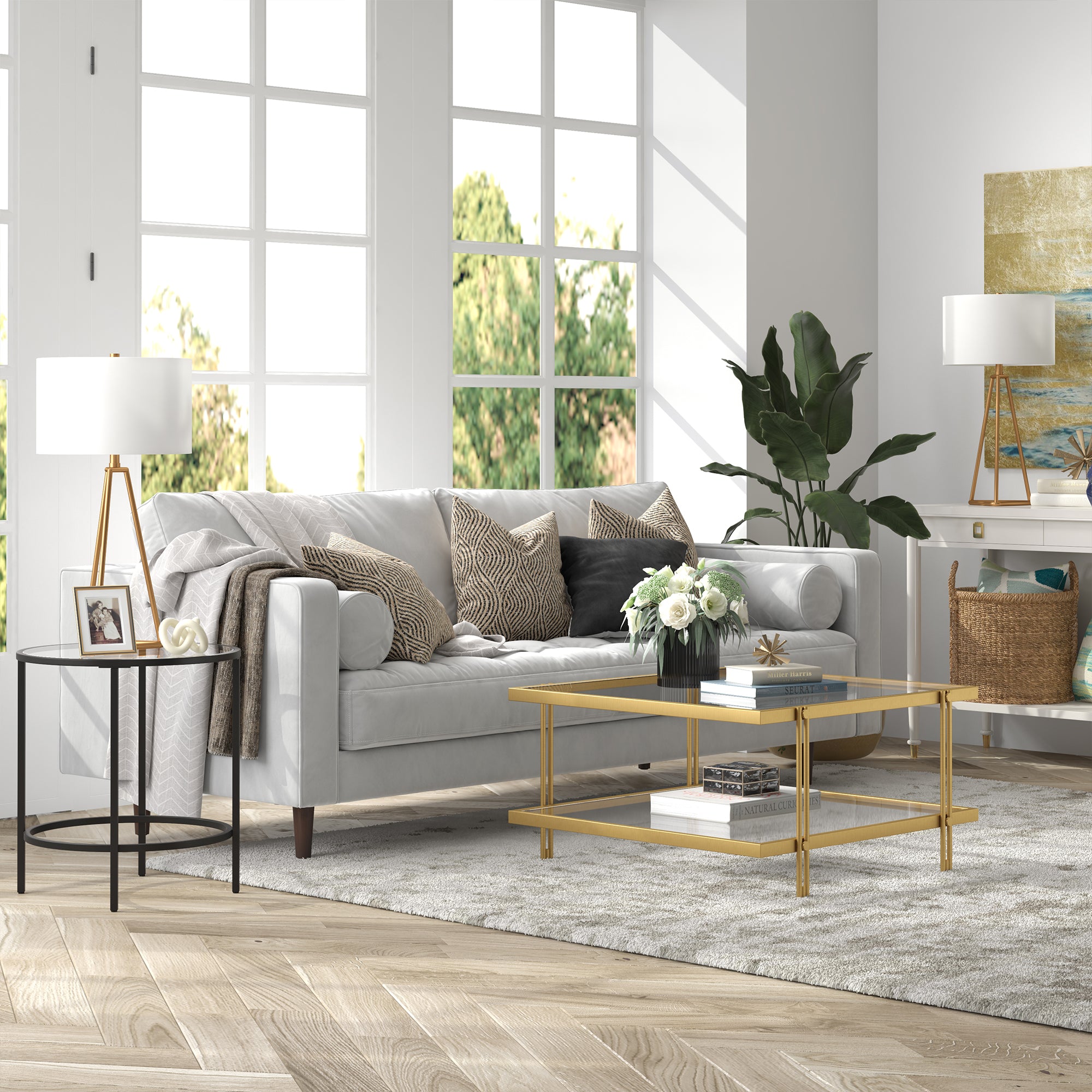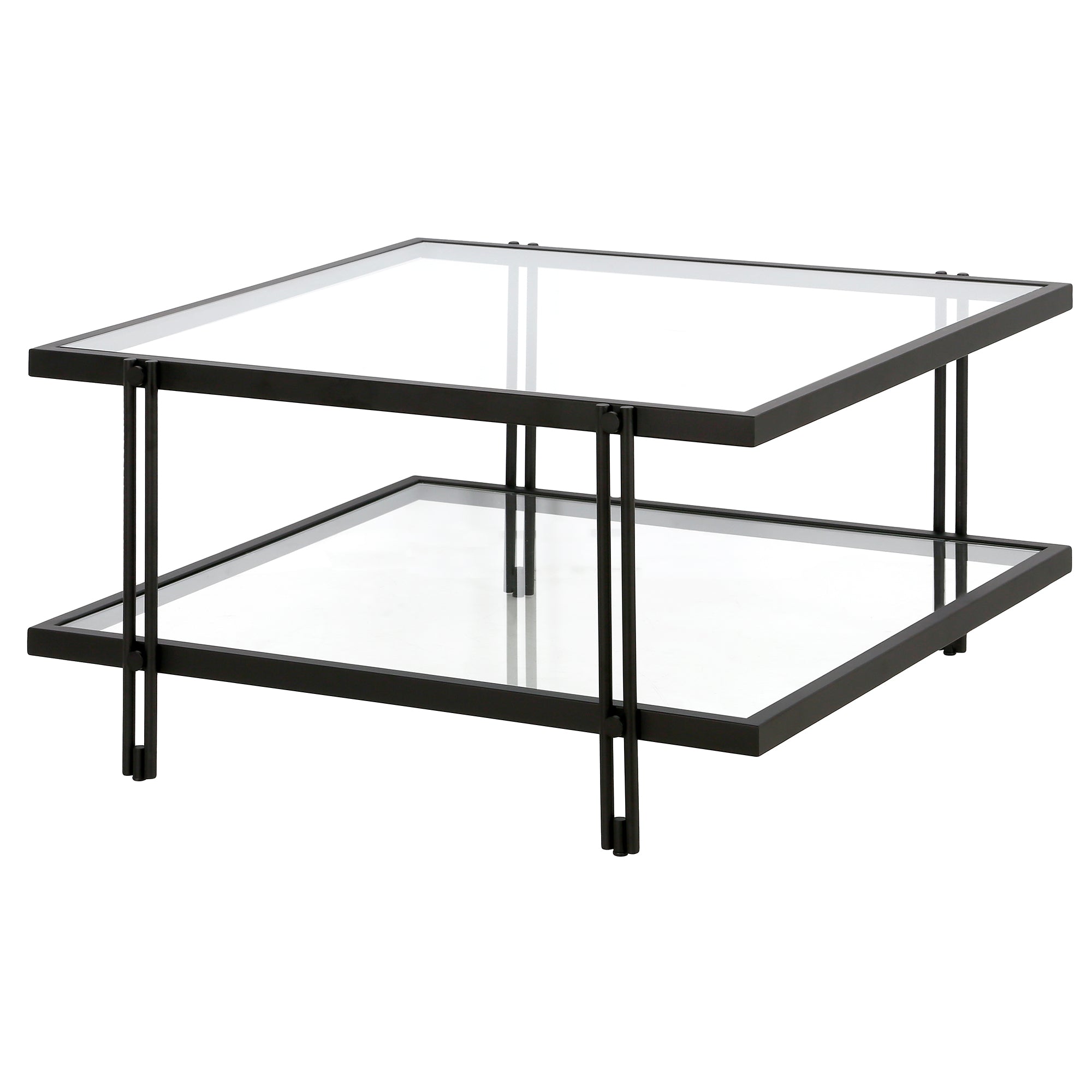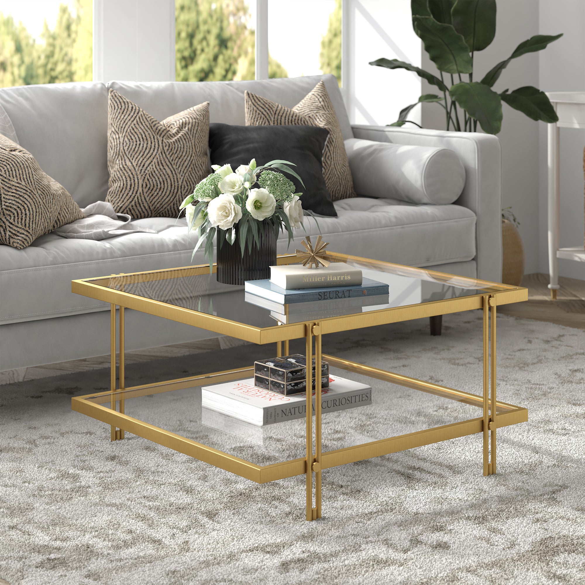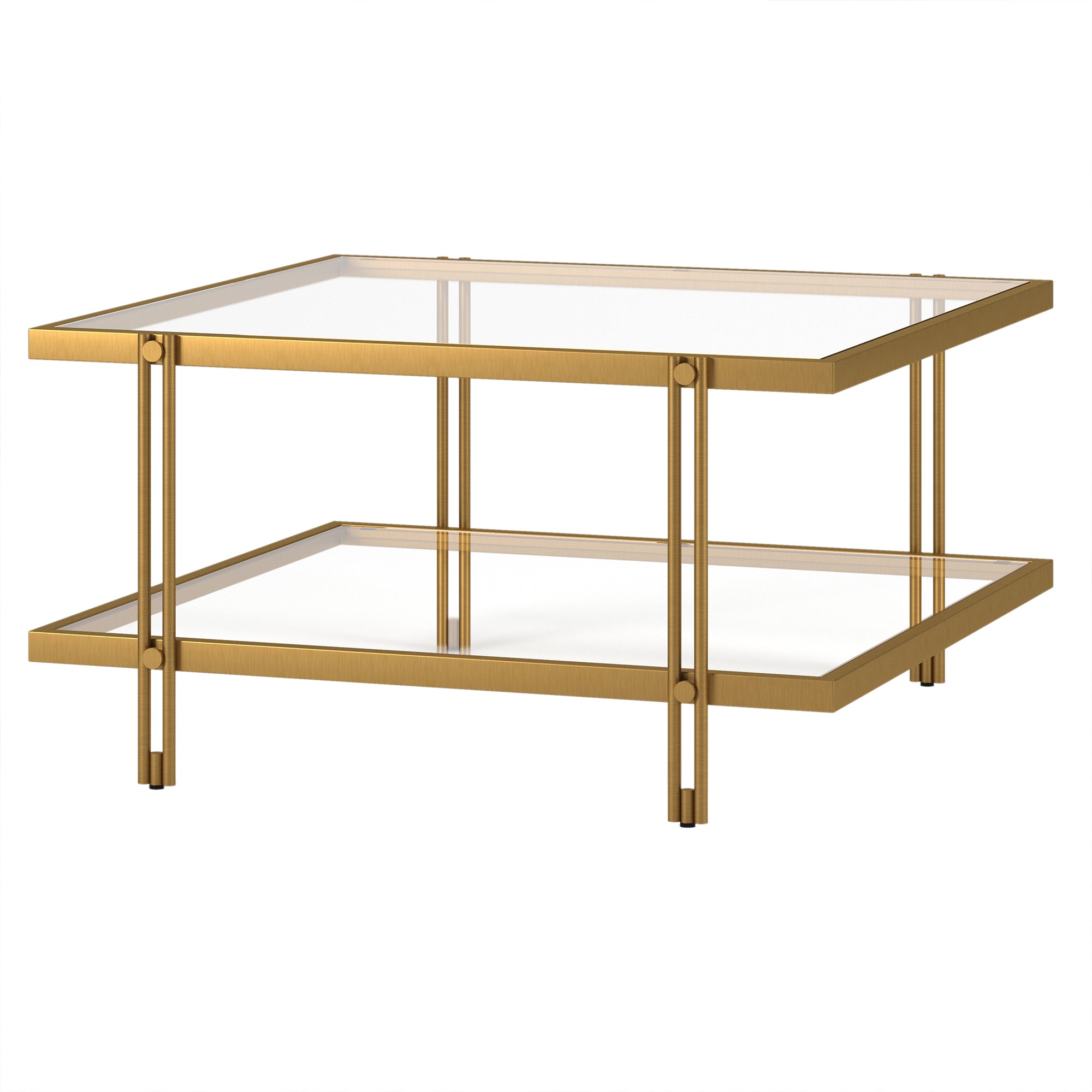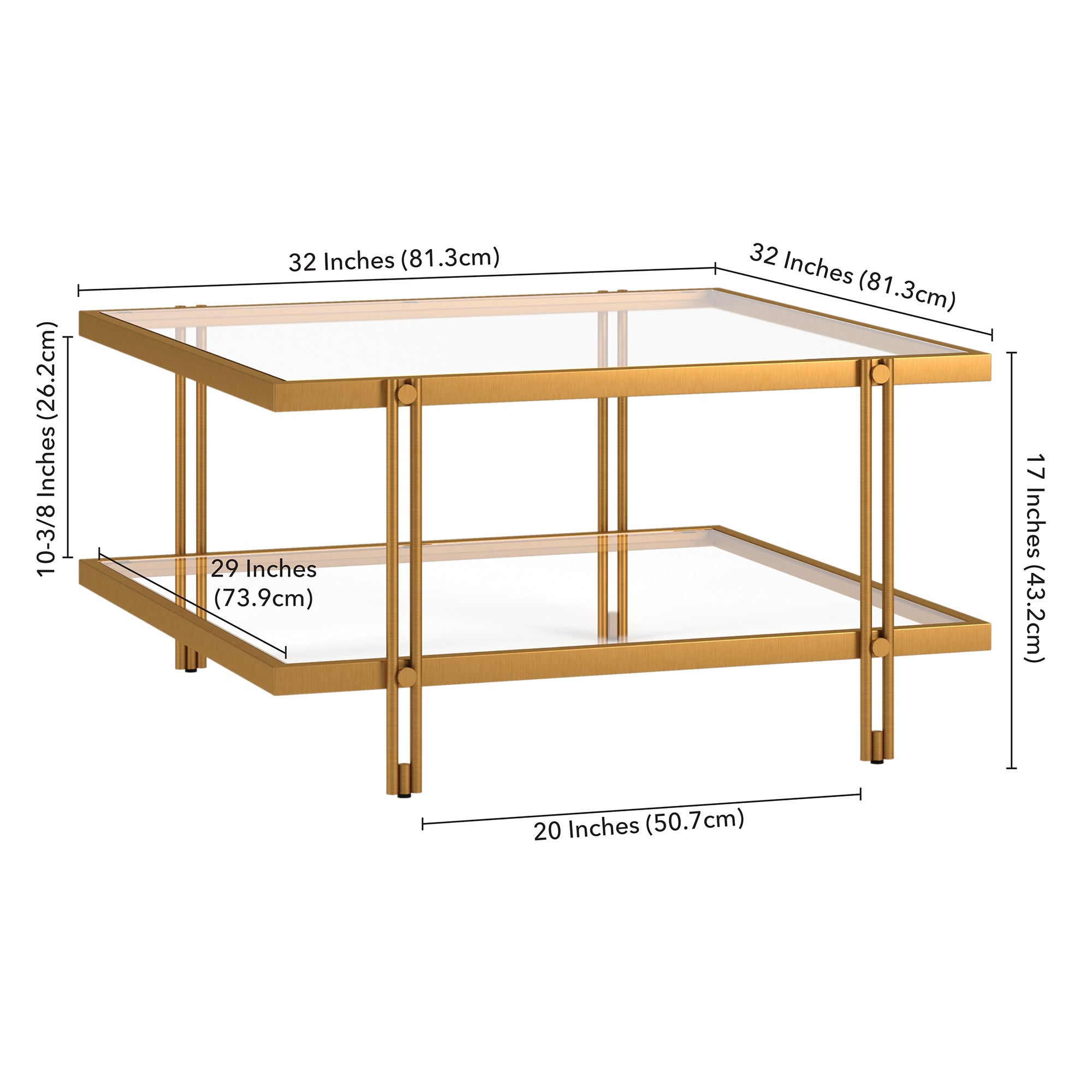 Complete your living room ensemble in modern style with this contemporary coffee table. Crafted of premium steel and finished in a warm neutral metallic finish, this coffee table features a clean-lined square silhouette on four double-barred legs. The open lower glass shelf is great for your book and magazine collections, or decorative collections.