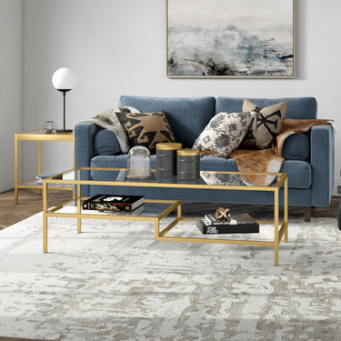 This contemporary coffee table is the perfect addition to your modern or glam living room ensemble. A lustrous metallic frame borders the tempered glass tabletop and two-tiered shelves. Balanced on four sleek legs, its minimalist silhouette blends seamlessly with your existing décor scheme.