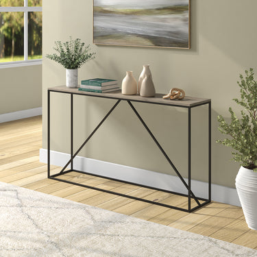 This console table is built for utility and design, featuring an on-trend wood-look top with a 40 lb. weight capacity. It's thouroughly modern blackened bronze frame features a diagonal center support that adds stability and visual interest. Its narrow profile makes this a perfect choice for compact spaces where you need that extra bit of storage.