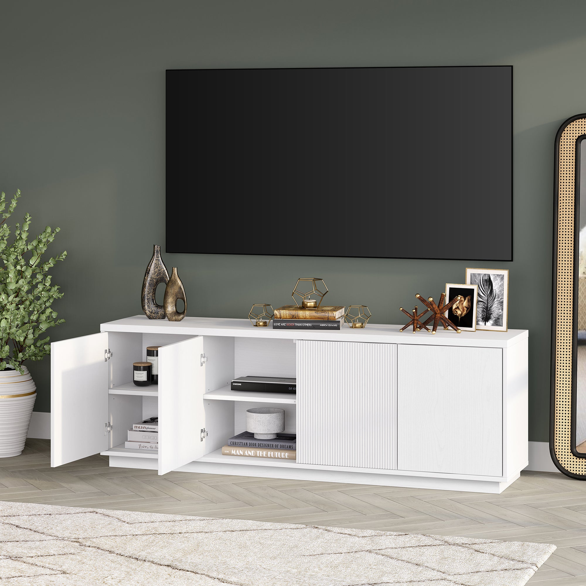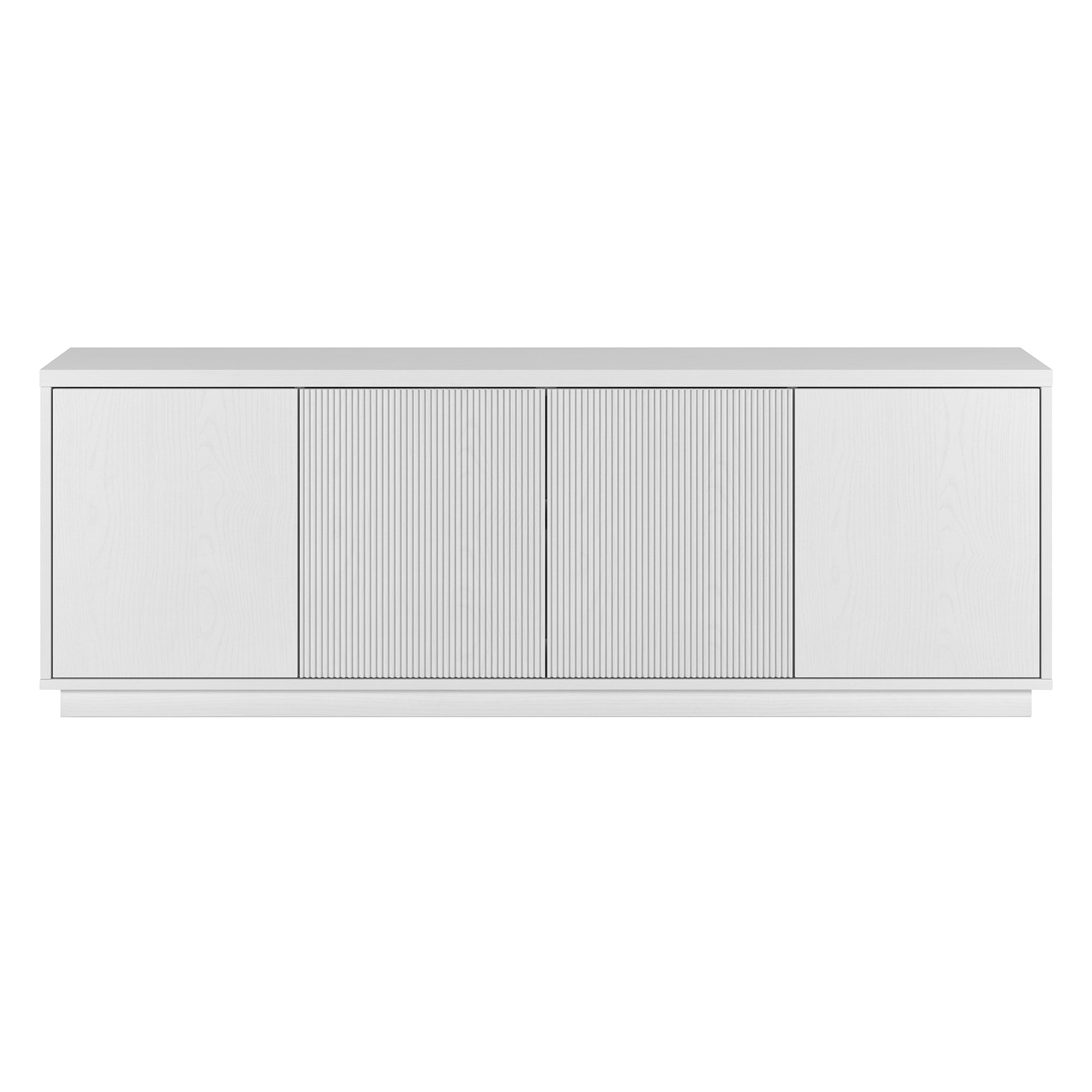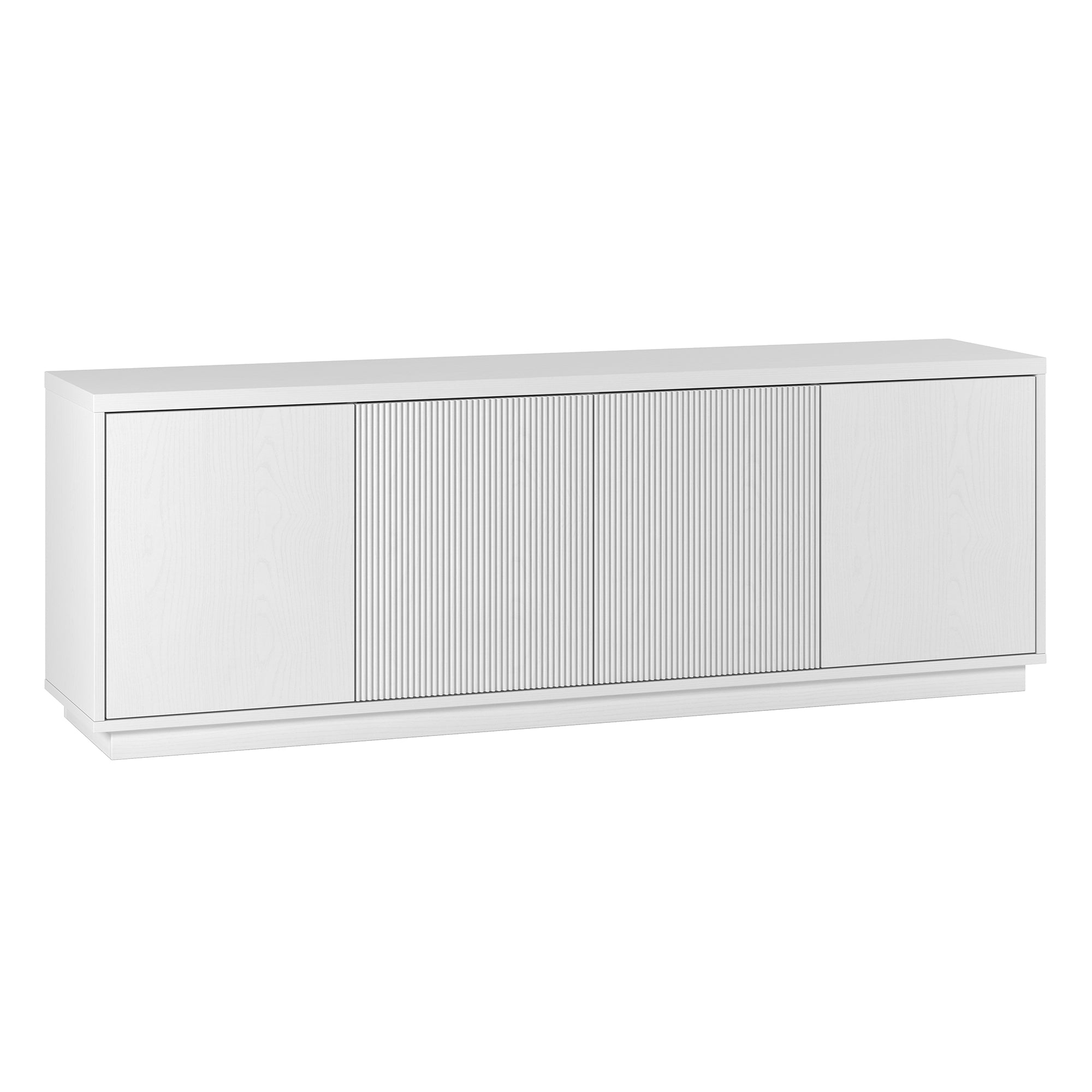 On-trend texture and design combine in this transitional TV stand. With a wood grain finish and textured center doors, this piece is sure to be a statement in your living room, den, or game room. The plinth base gives an illusion of a seamless transition from your floor, as if it was always meant to be there. The modern contemporary design of the stand features 4 fully enclosed doors with three separate compartments, allowing for ample storage for your devices, games, books, and more.