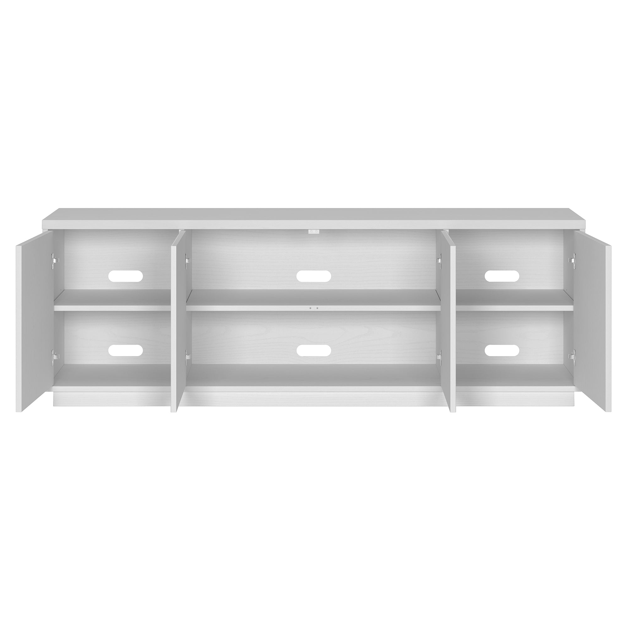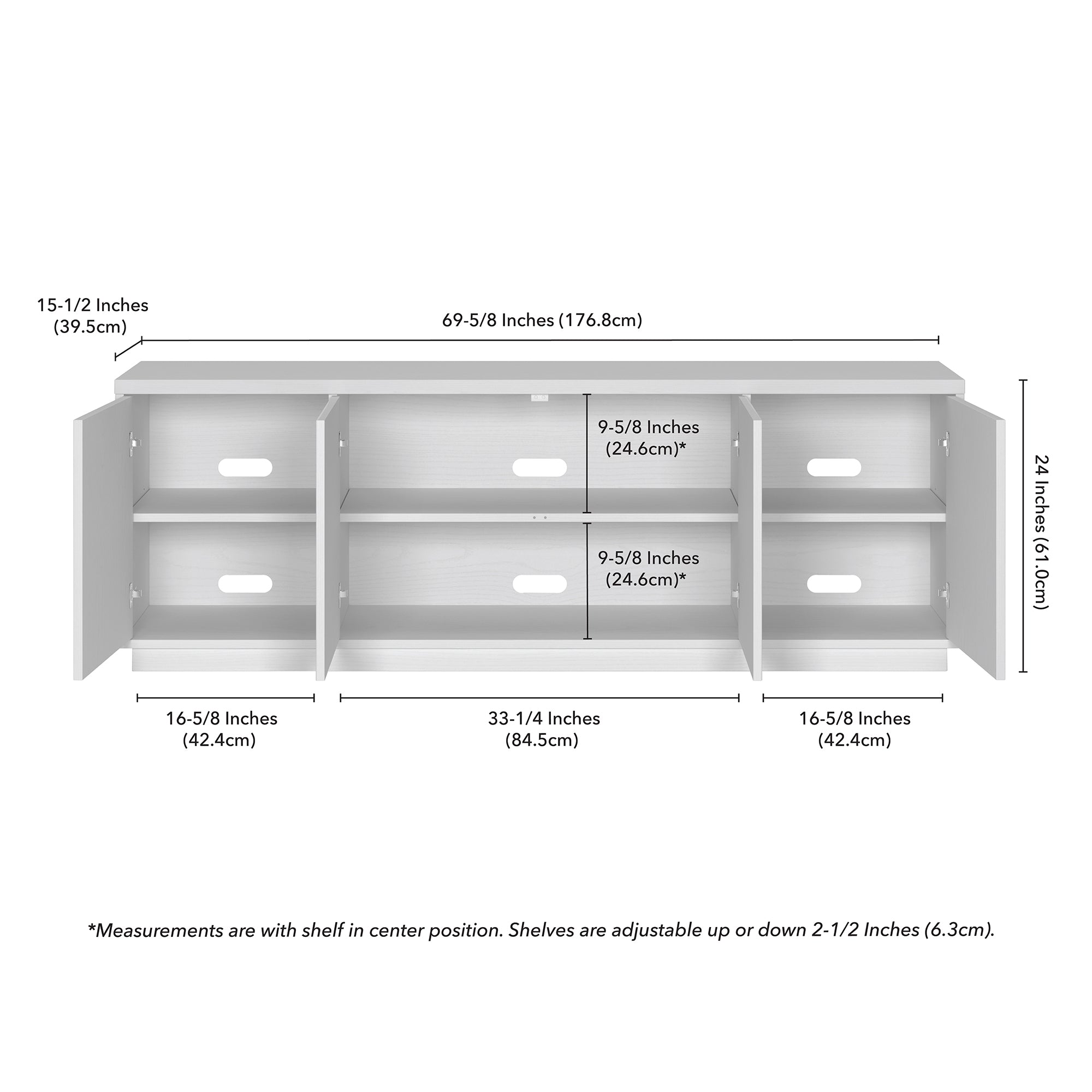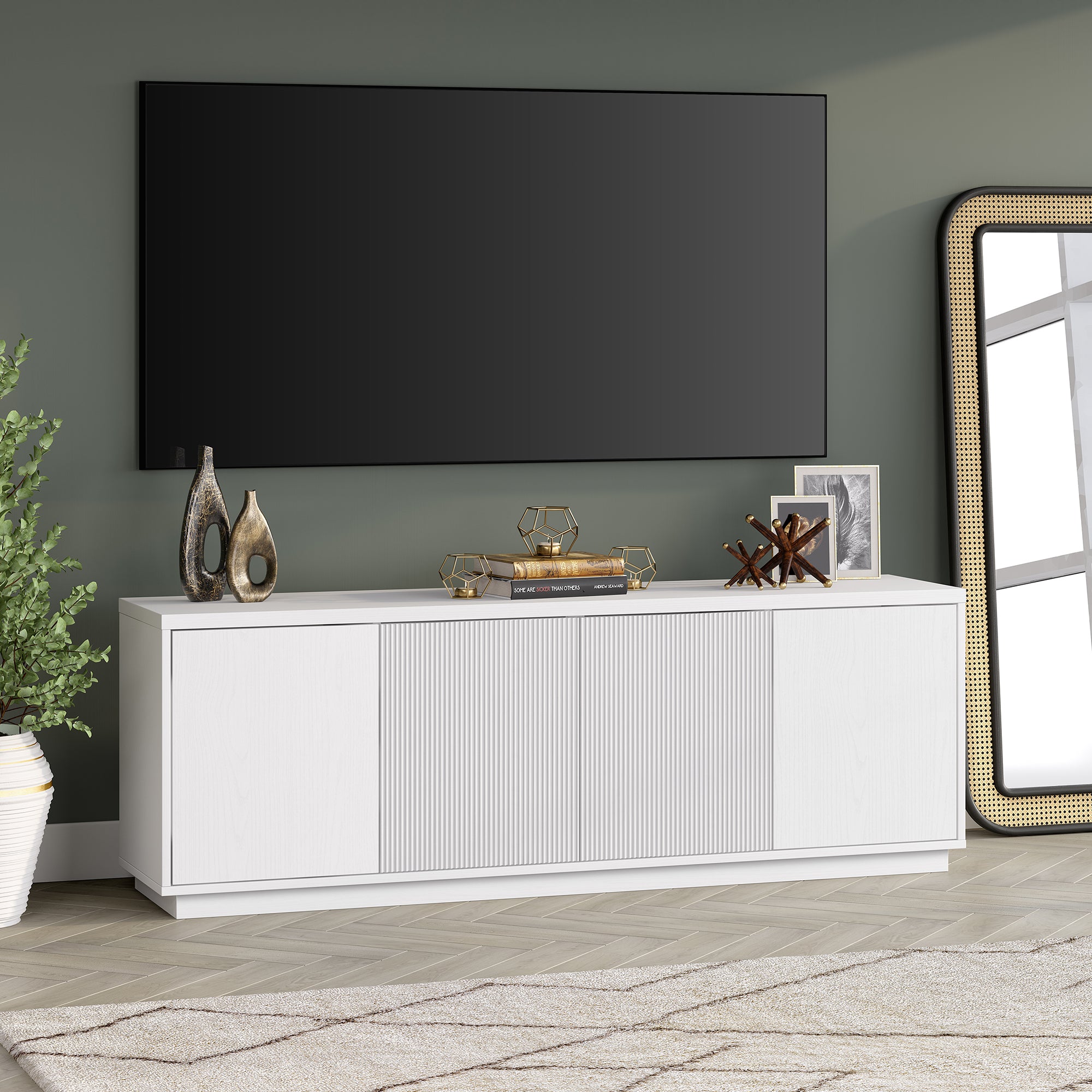 On-trend texture and design combine in this transitional TV stand. With a wood grain finish and textured center doors, this piece is sure to be a statement in your living room, den, or game room. The plinth base gives an illusion of a seamless transition from your floor, as if it was always meant to be there. The modern contemporary design of the stand features 4 fully enclosed doors with three separate compartments, allowing for ample storage for your devices, games, books, and more.