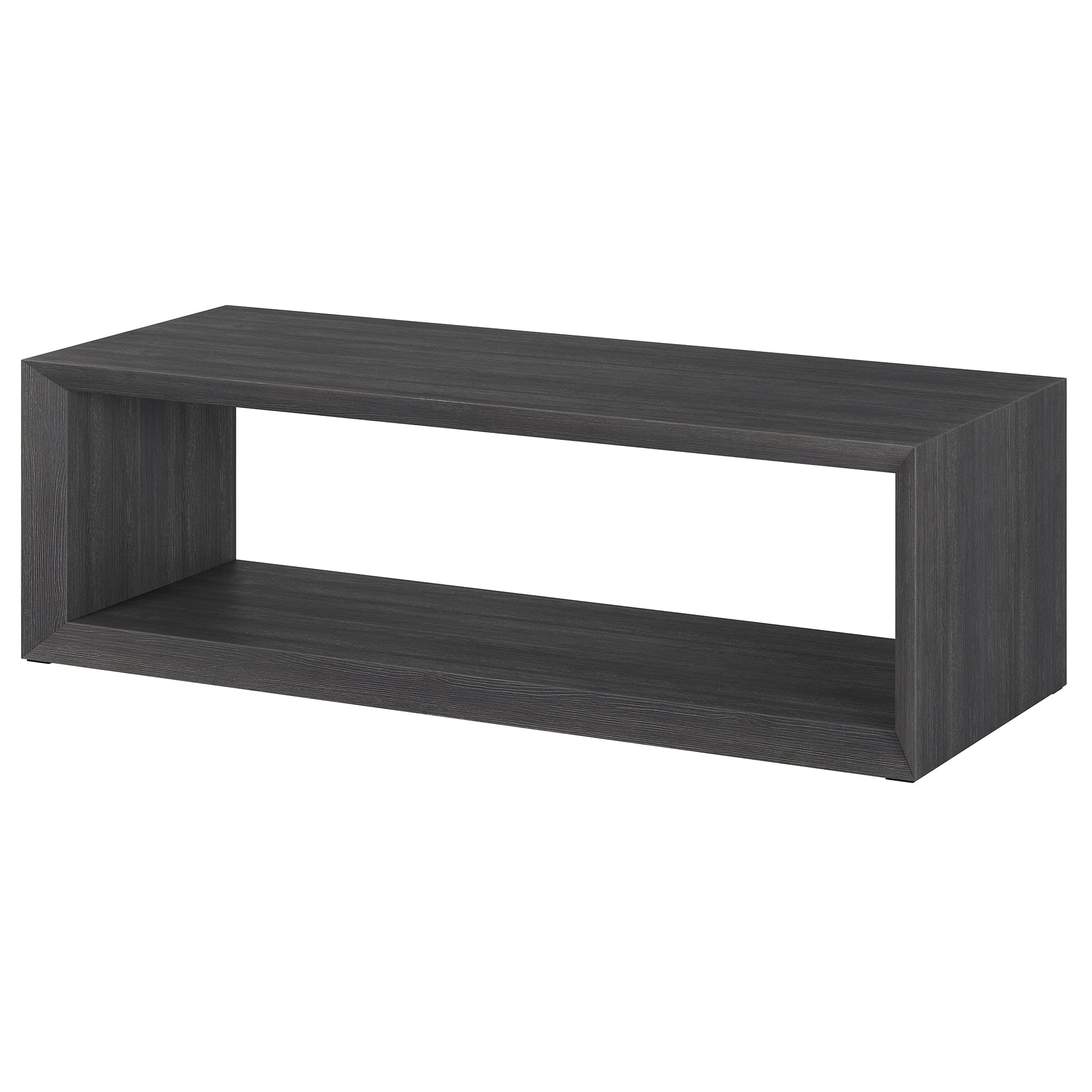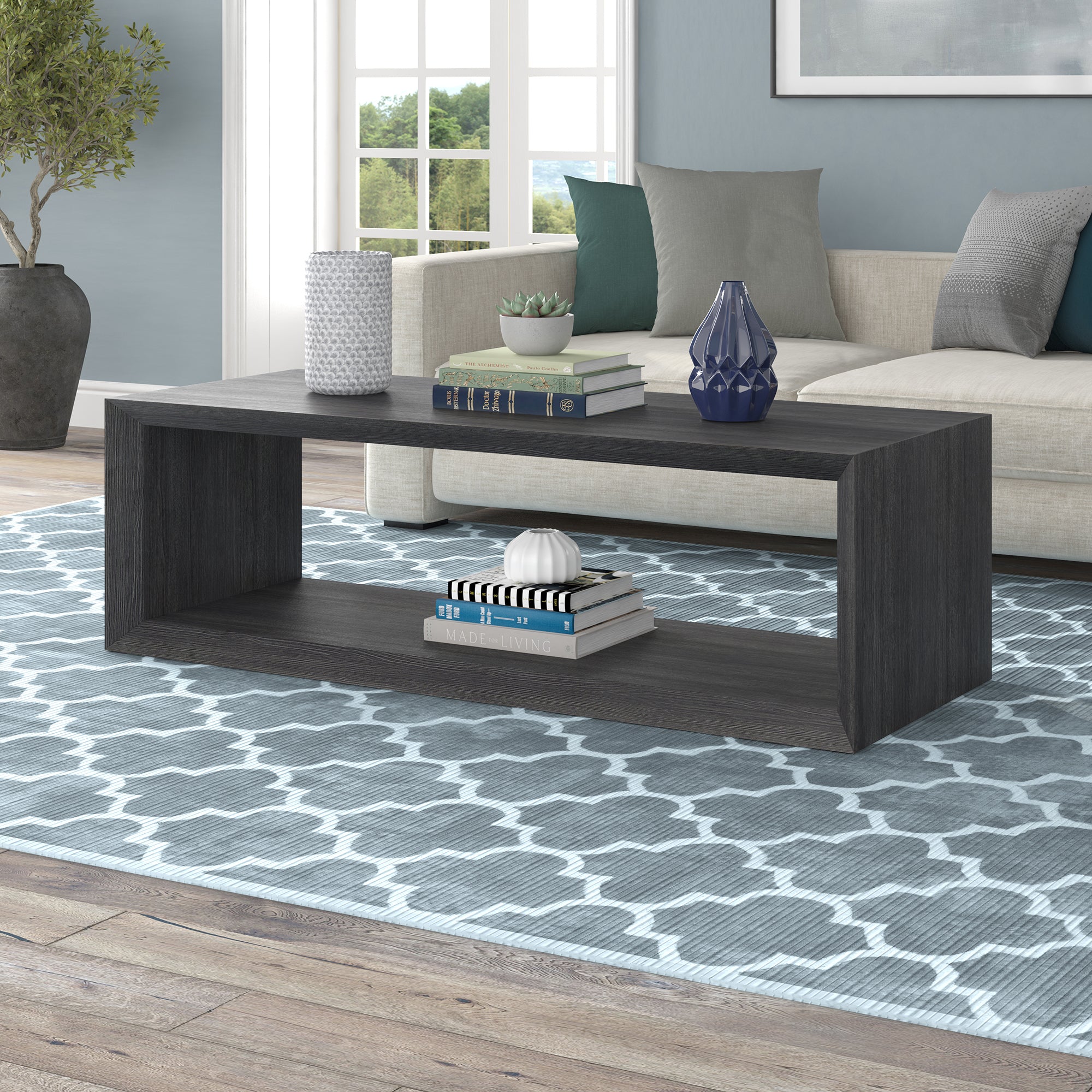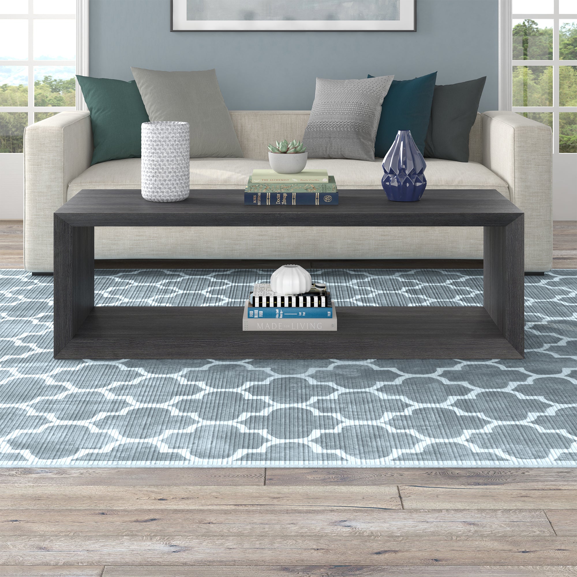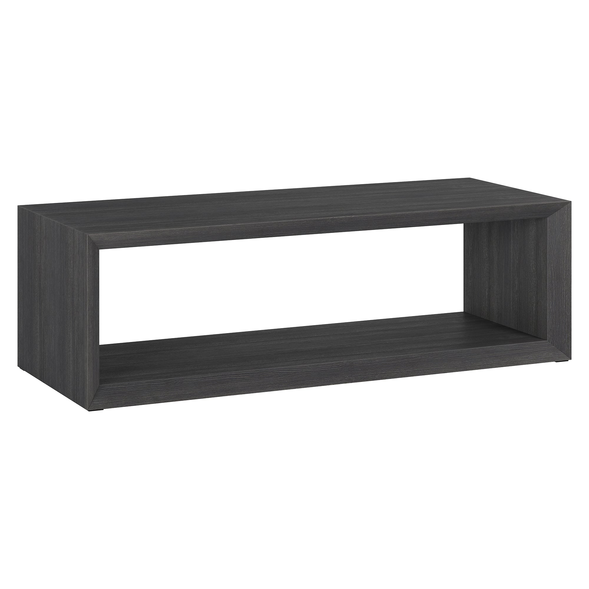 Striking in its simplicity, this modern coffee table emphasizes clean lines and straightforward design. The table's seamless design is given extra dimension with the beveled banding around the edges. The solid base anchors the look, while the natural wood-look finish adds texture and tonal variation to your space. With an assembly time under 10 minutes, this is the perfect piece to effortlessly update your living room, family room, or office.