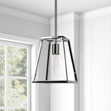 Bring an industrial, modern feel to your living space with this geometric, open-framed pendant. Featuring a clean-cut, rhombus shaped frame allowing an exposed view to the bulb (not included). The hardware is finished in cool silver nickel and includes an 8 ft polyester cord.