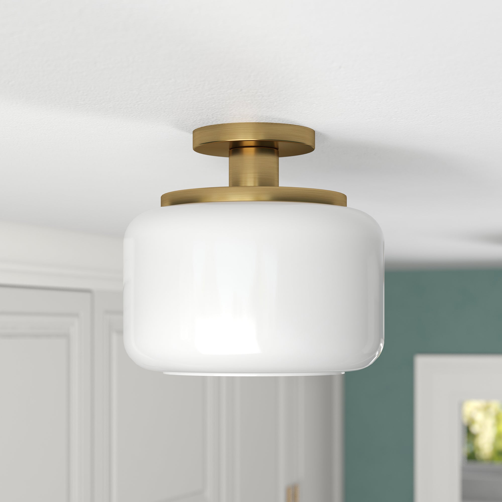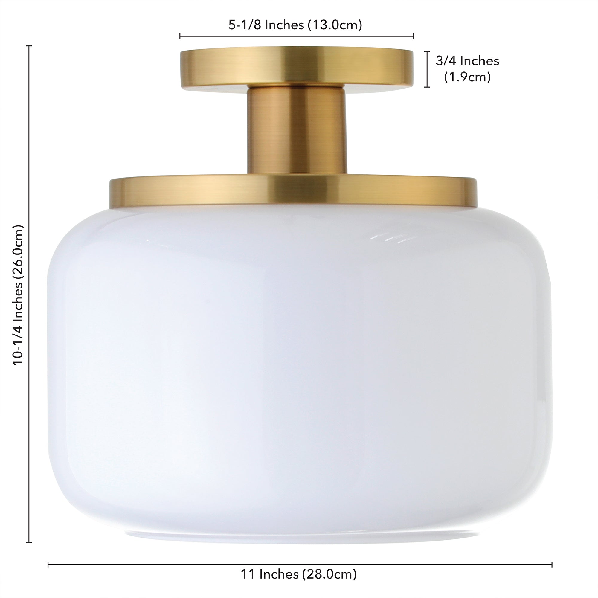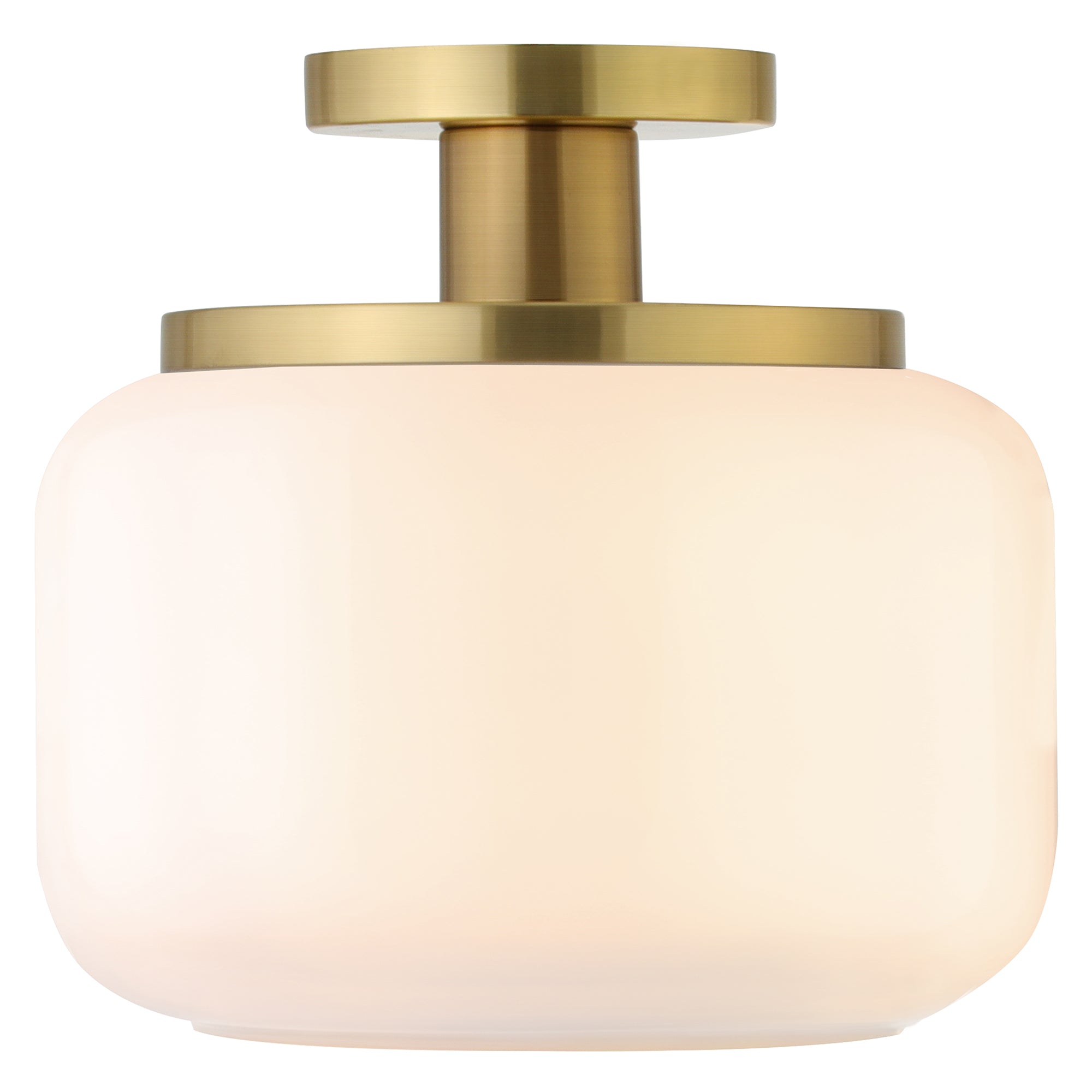 This globe and stem style semi flush mount ceiling light adds a playfully retro vibe to your space. Reminiscent of a vintage gas station light, this fixture gets a modern update in a warm metallic finish that perfectly offsets the classic glass drum shade. Effortlessly create a classic mid-century look in your entranceway, hallway, or dining room