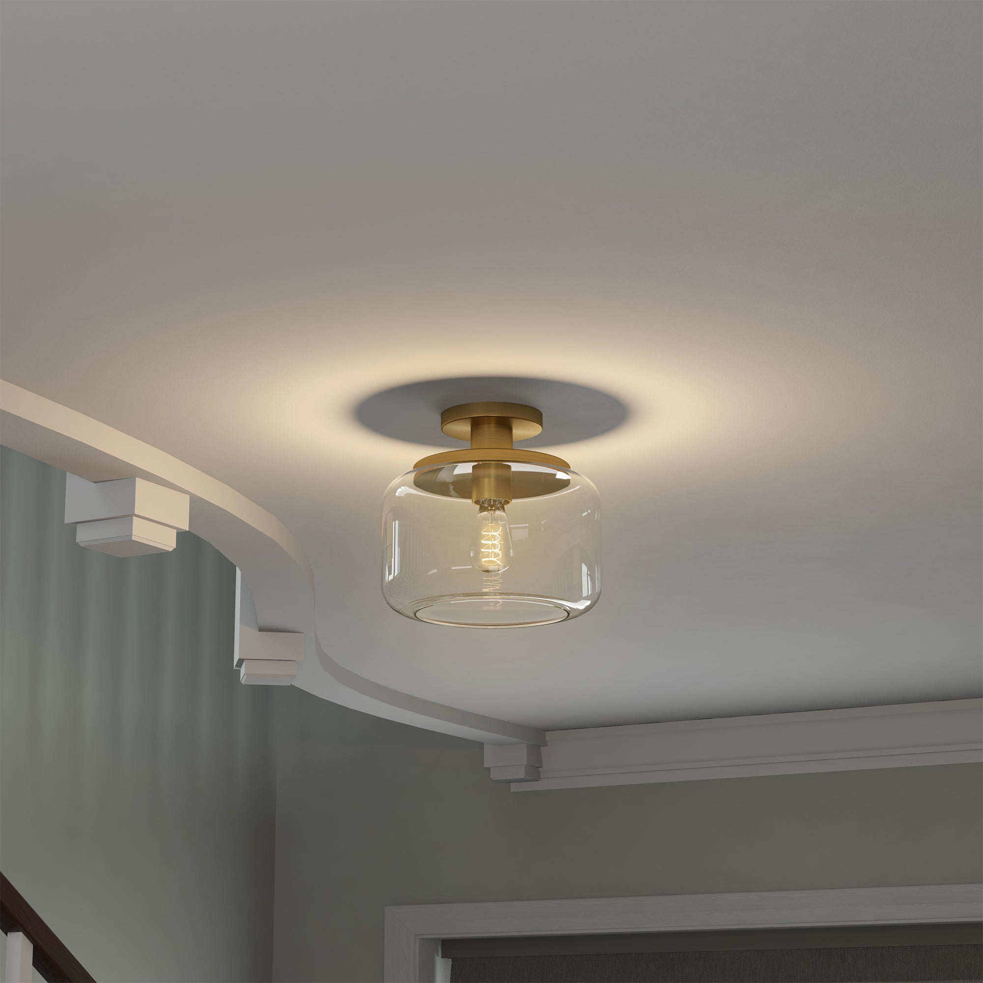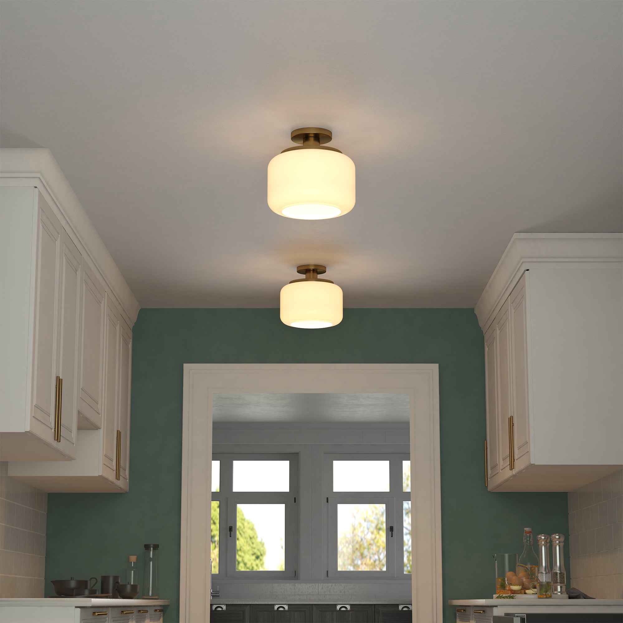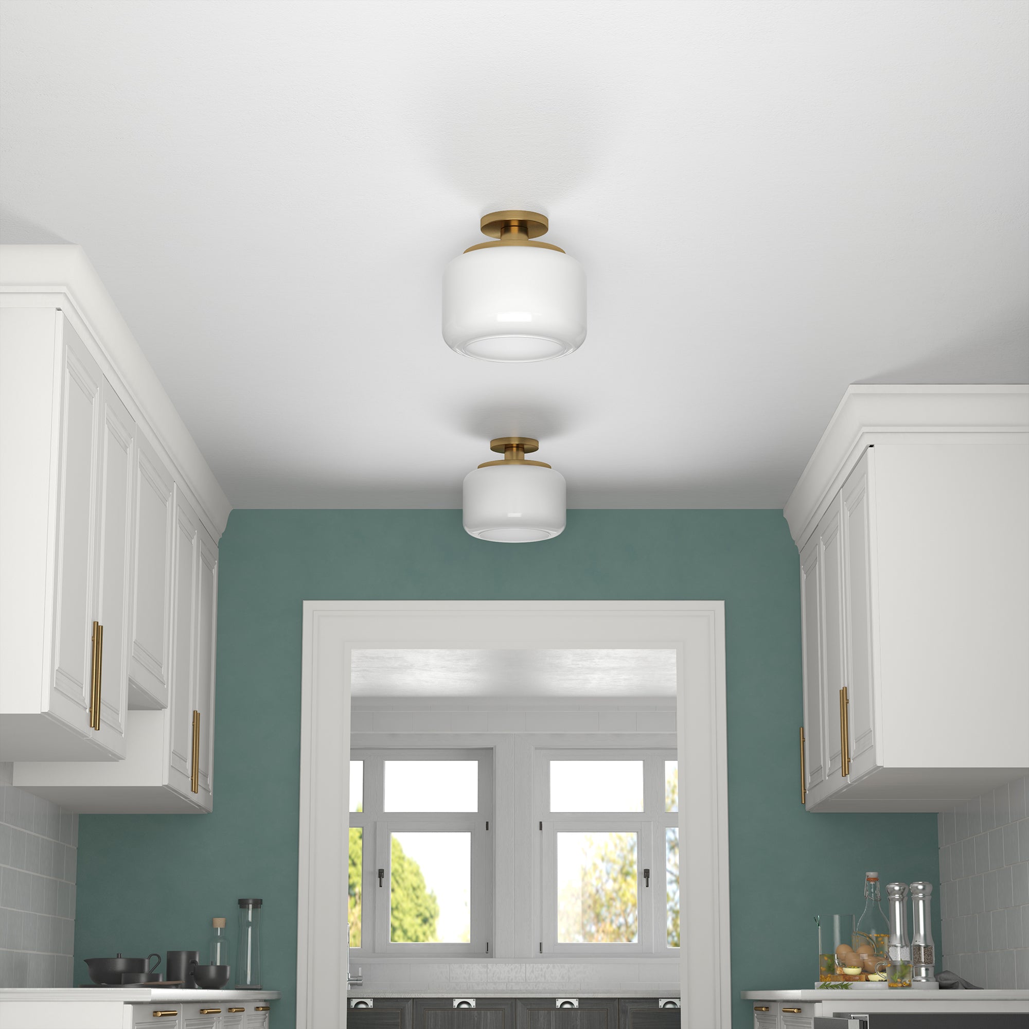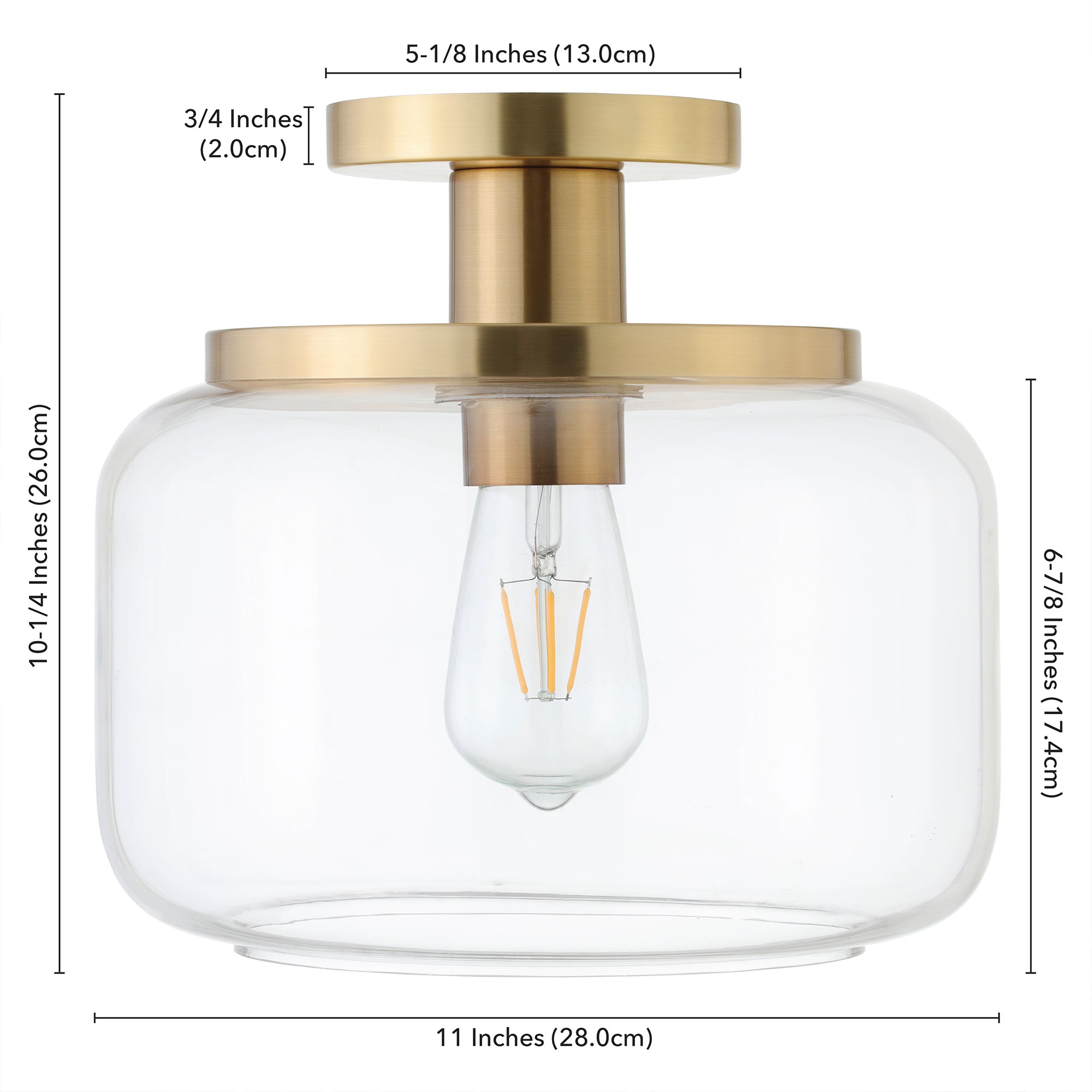 This globe and stem style semi flush mount ceiling light adds a playfully retro vibe to your space. Reminiscent of a vintage gas station light, this fixture gets a modern update in a warm metallic finish that perfectly offsets the classic glass drum shade. Effortlessly create a classic mid-century look in your entranceway, hallway, or dining room