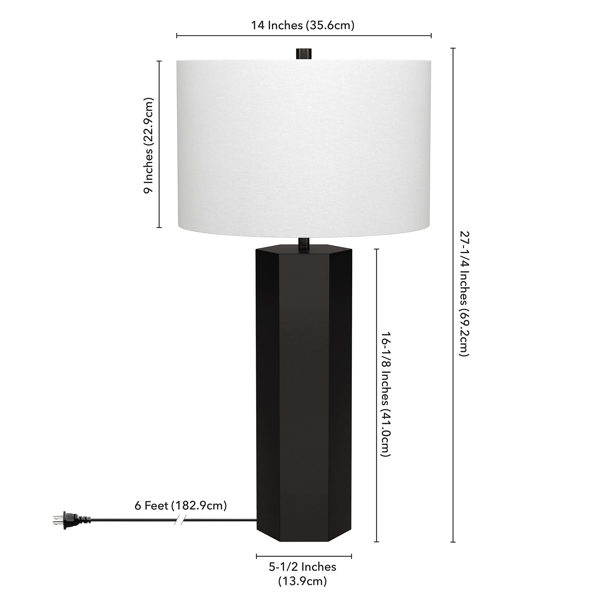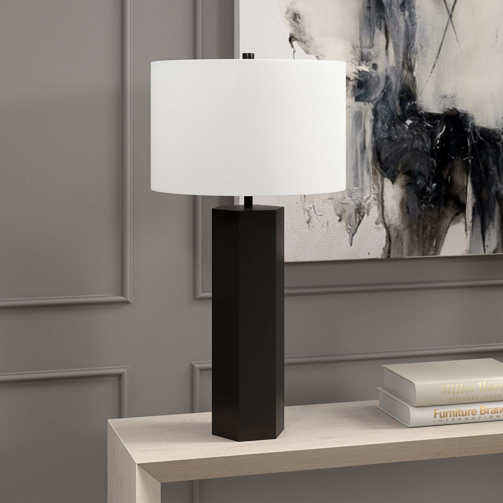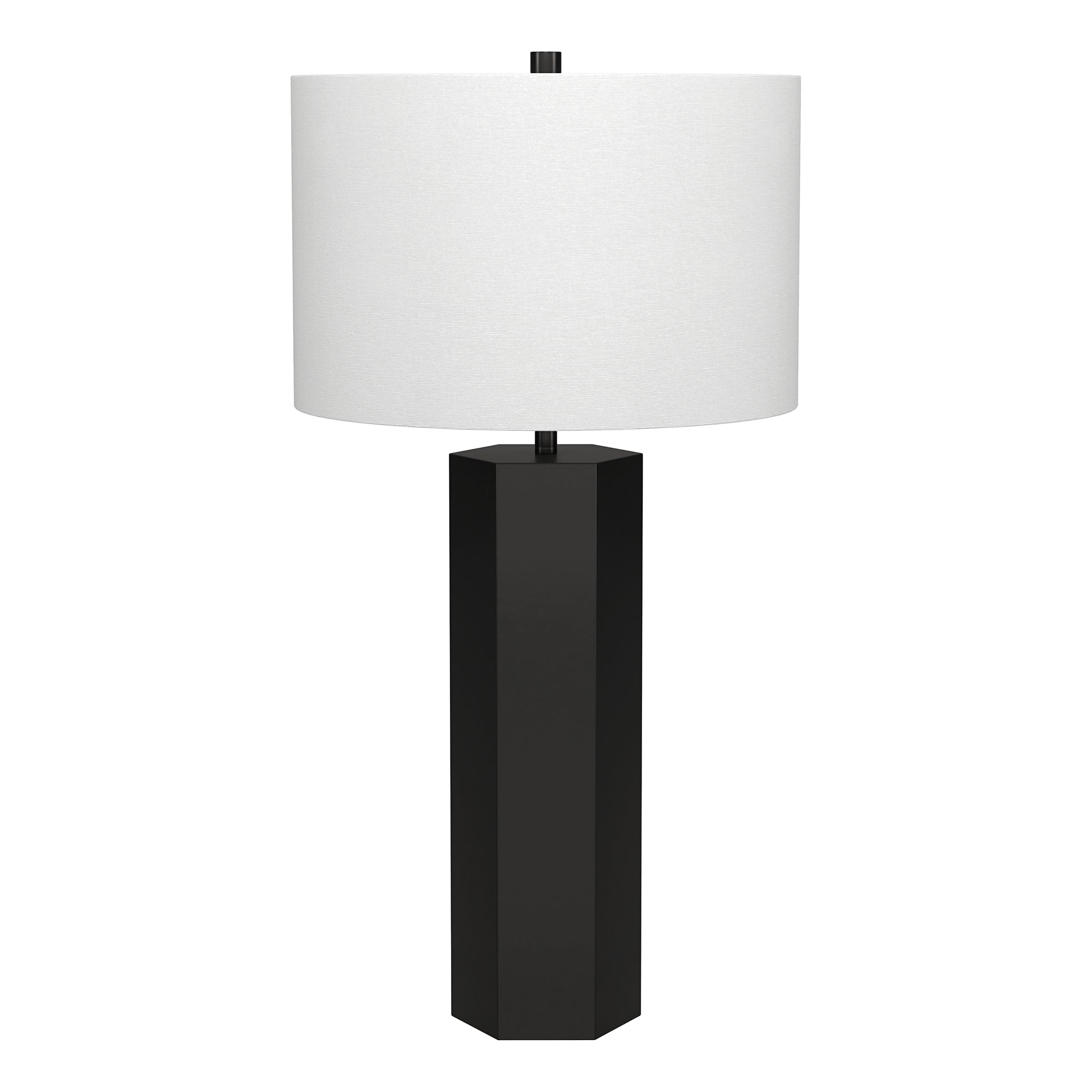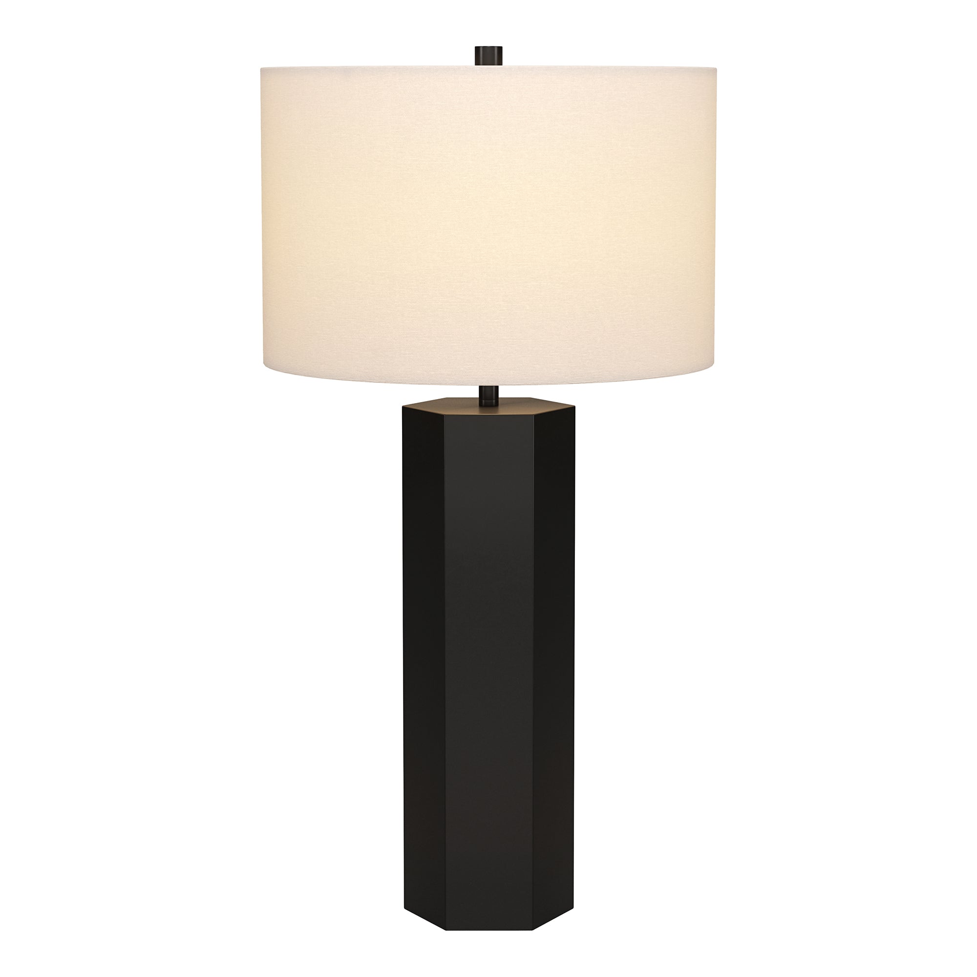 A modern take on a mid-century design, this table lamp offers a streamlined look and dramatic edges. The drum shaped fabric shade atop a geometric column base, blending a modern look with a warm inviting glow. Simple yet eye-catching, this lamp will illuminate your bedside, reading nook, or living room in style.