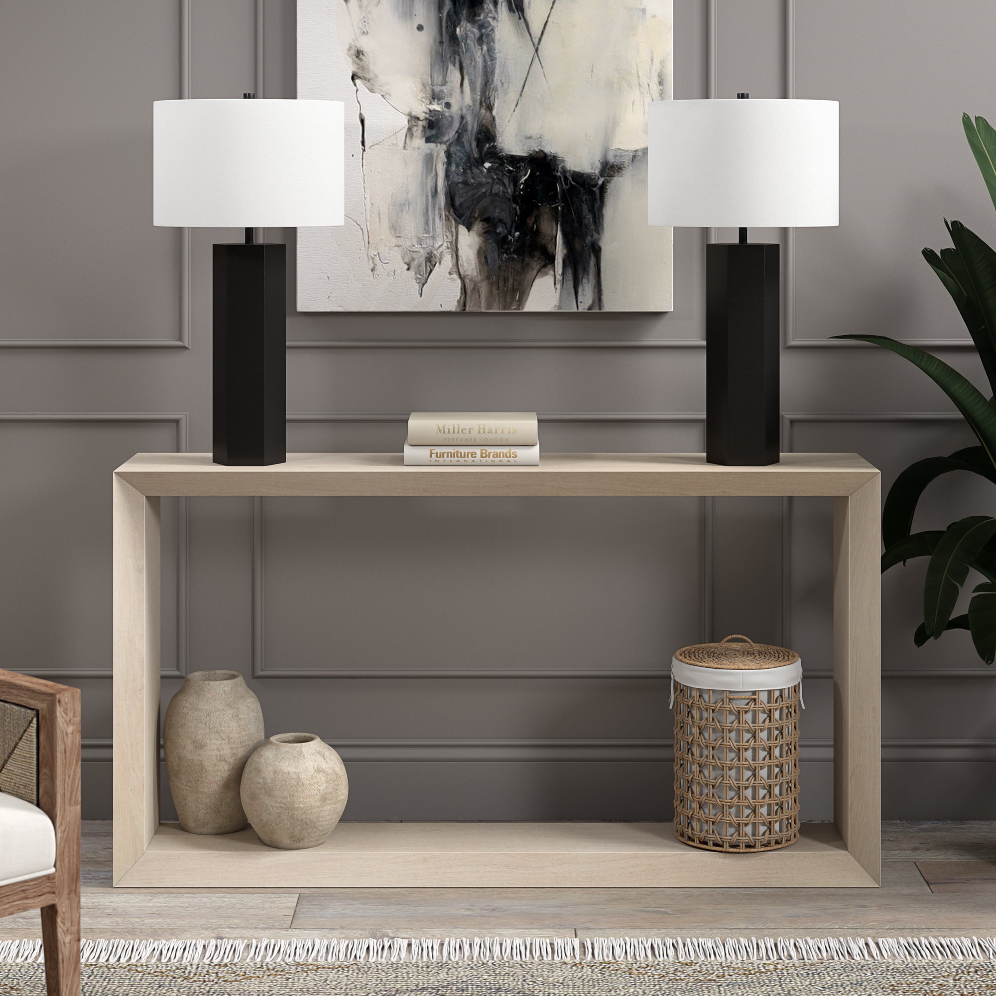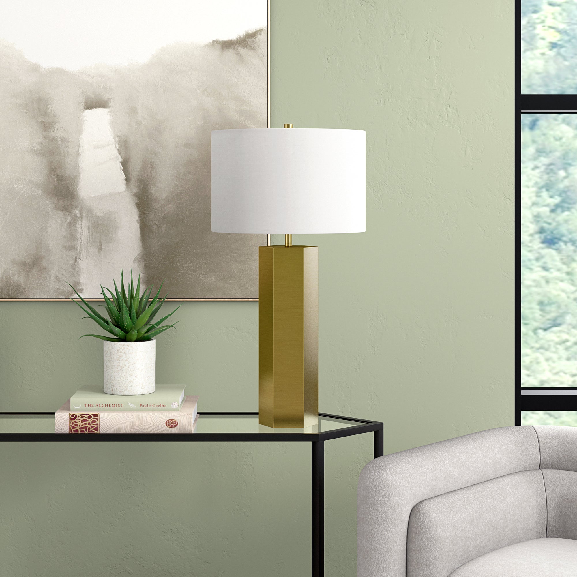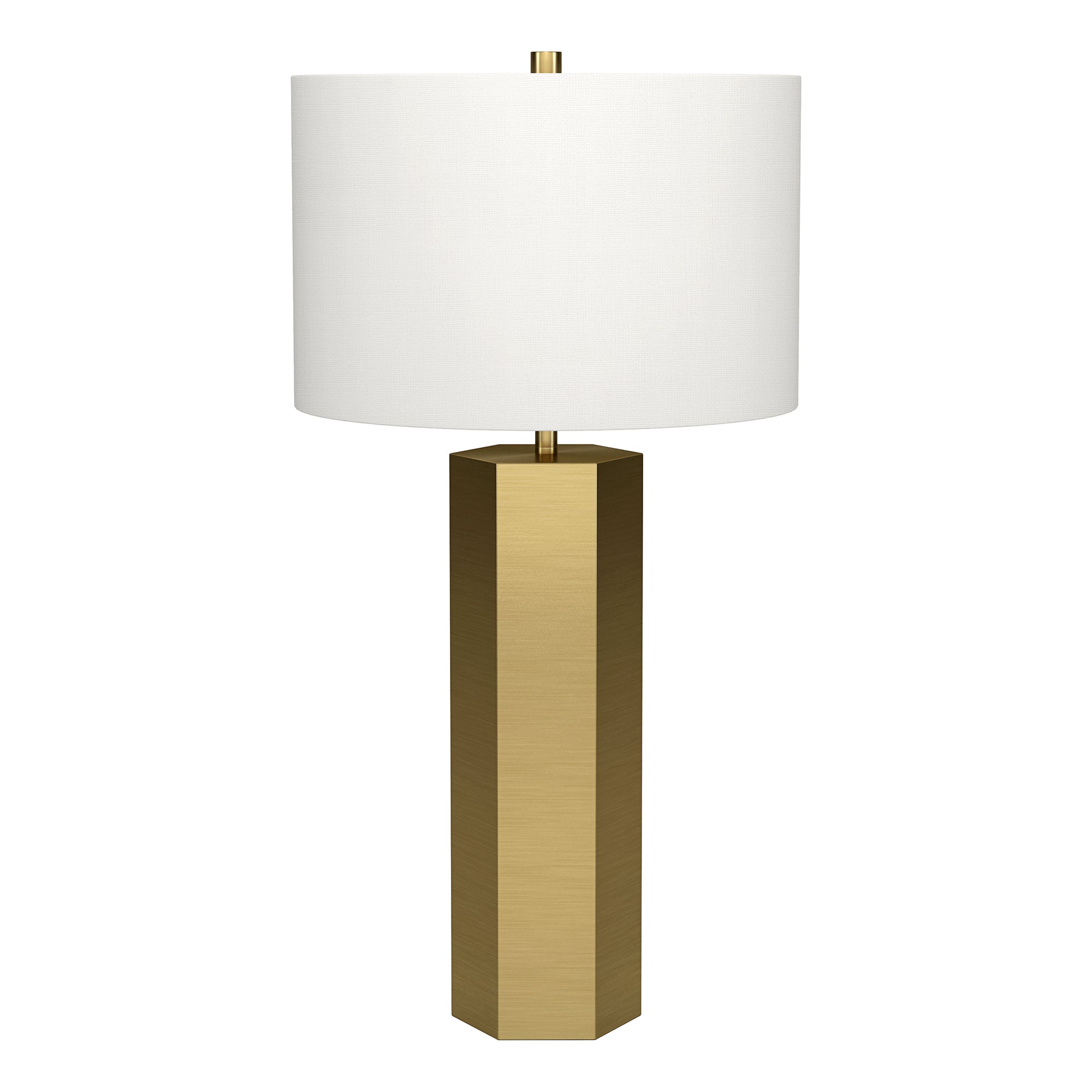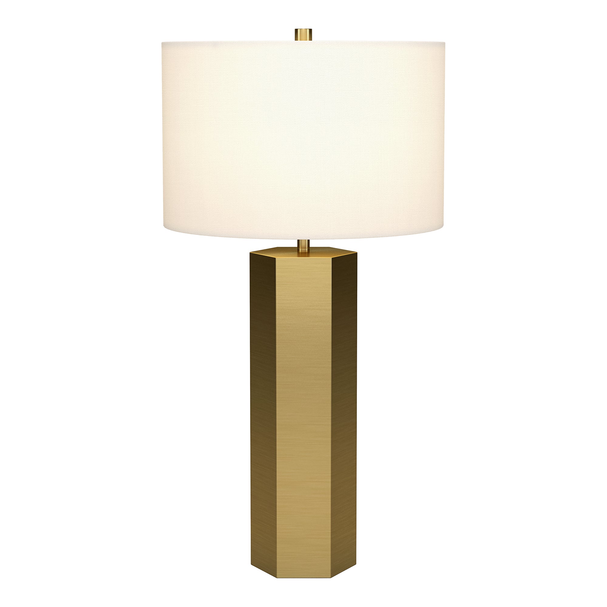 A modern take on a mid-century design, this table lamp offers a streamlined look and dramatic edges. The drum shaped fabric shade atop a geometric column base, blending a modern look with a warm inviting glow. Simple yet eye-catching, this lamp will illuminate your bedside, reading nook, or living room in style.